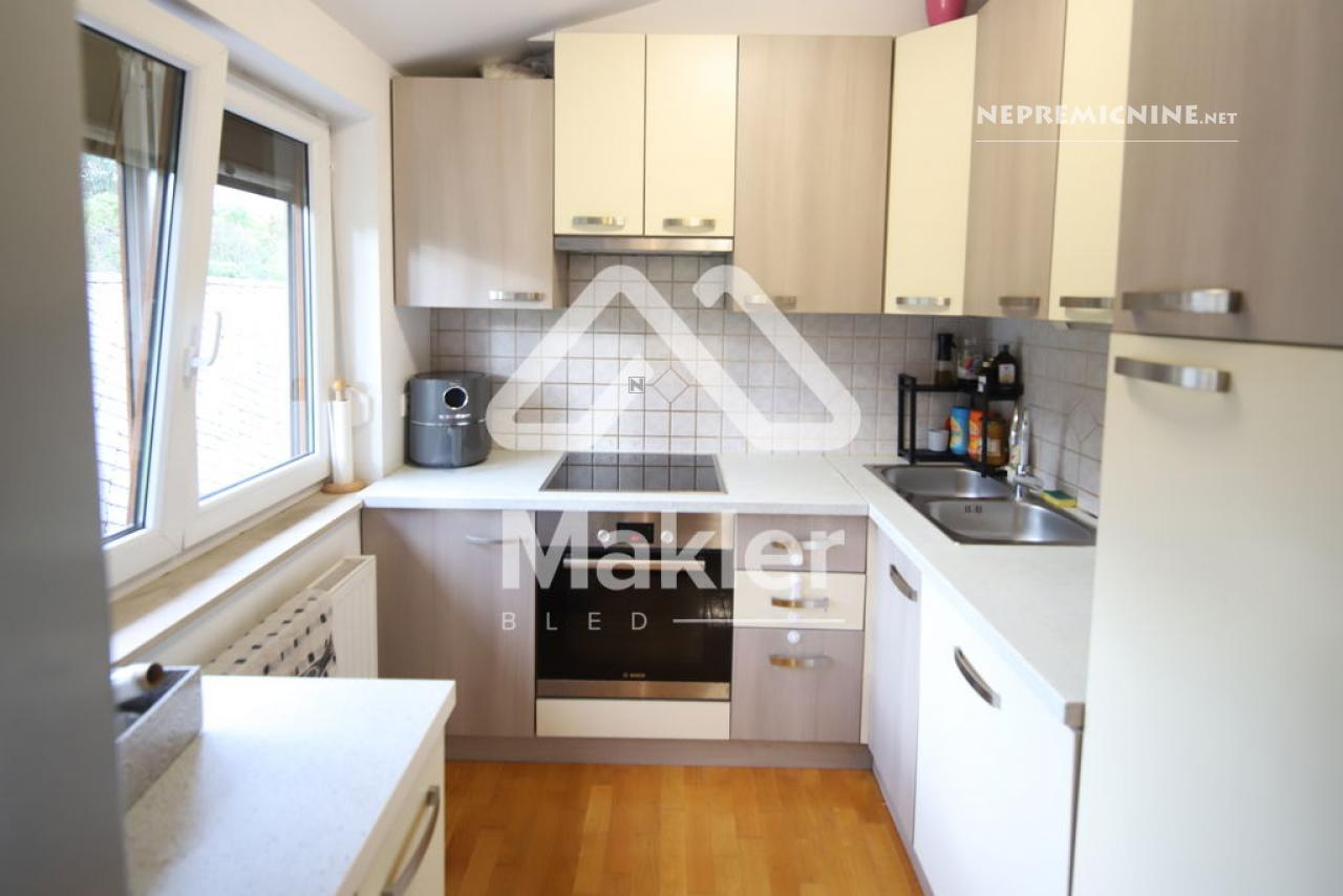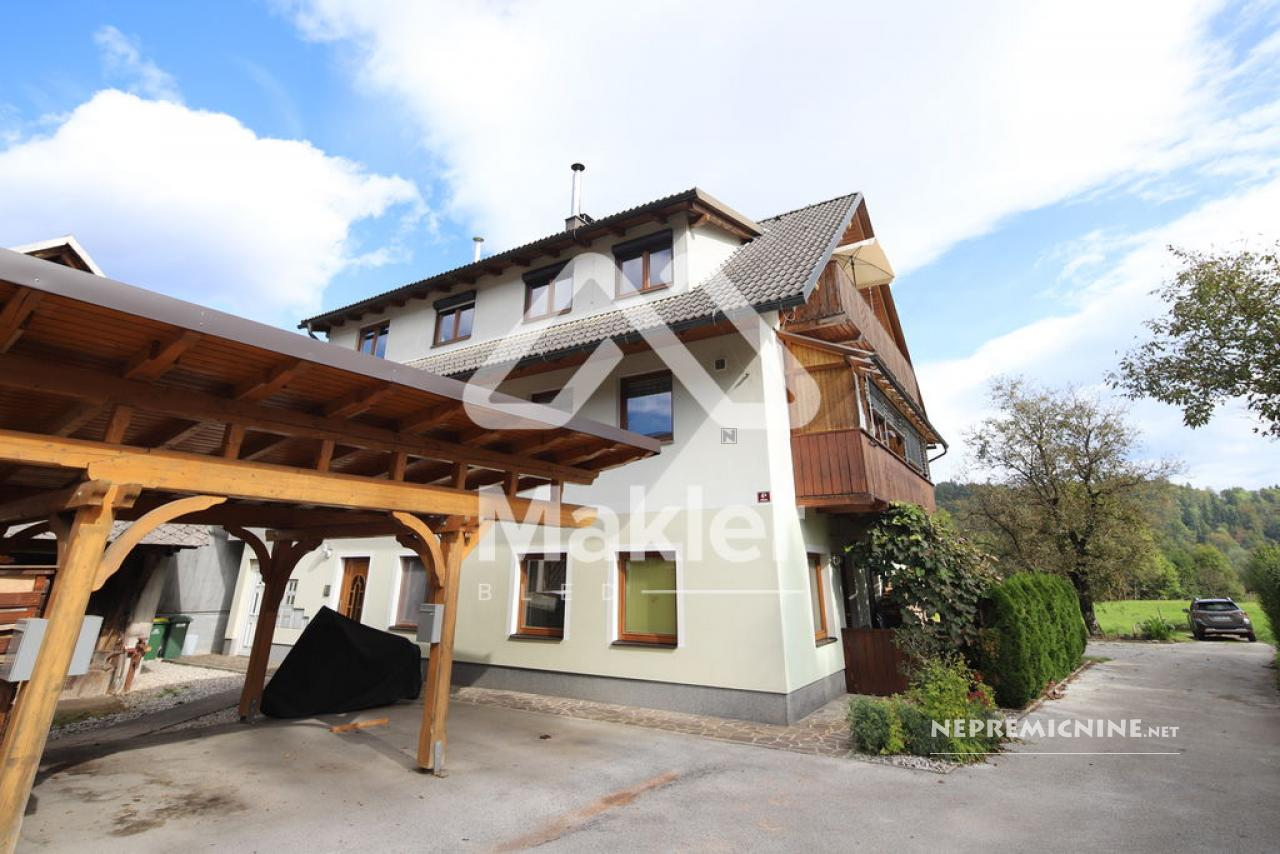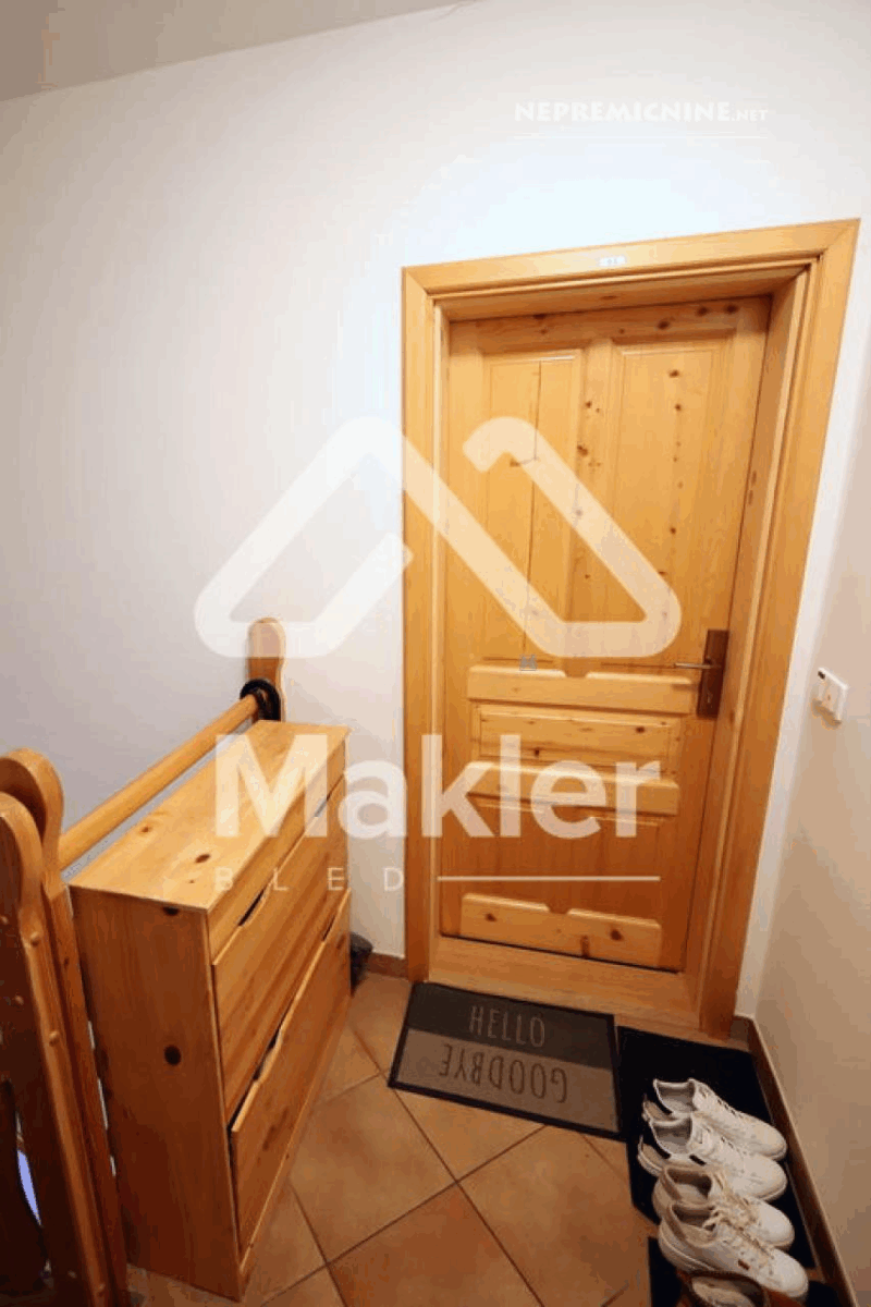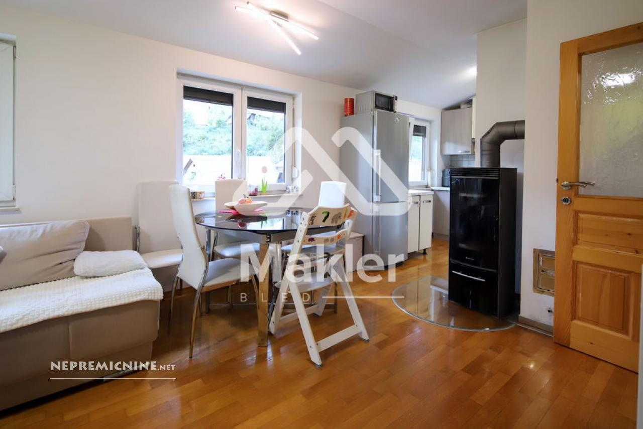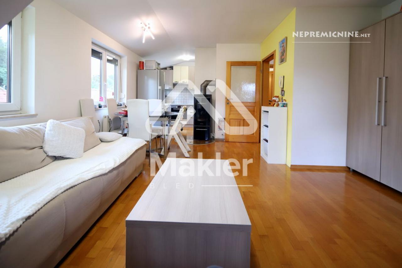 Dit prachtige 2,5-kamer appartement in Brezje, gelegen in de regio Gorenjska, biedt een unieke kans voor diegenen die op zoek zijn naar een rustige en zonnige woonomgeving. Het appartement bevindt zich in een gebouw met slechts vijf wooneenheden, gebouwd in 2008 met hoogwaardige klassieke bouwmaterialen. Het appartement is gelegen op de bovenste verdieping, wat zorgt voor een prachtig uitzicht op de omgeving. Het beschikt over een ruime woonkamer met veel natuurlijk licht, een keuken, eetkamer, en een zonnig balkon. Er zijn twee slaapkamers, een kinderkamer en een badkamer. Het appartement heeft ook een eigen tuin van 75 m², ideaal voor buitenactiviteiten en ontspanning. De locatie biedt gemakkelijke toegang tot de stad Radovljica, met tal van recreatiemogelijkheden en voorzieningen in de buurt. Het appartement is voorzien van een airconditioningsysteem en een houtkachel voor verwarming. Een eigen parkeerplaats onder een houten carport is inbegrepen. Dit appartement is perfect voor een gezin dat op zoek is naar een comfortabele en praktische woonruimte in een prachtige natuurlijke omgeving.