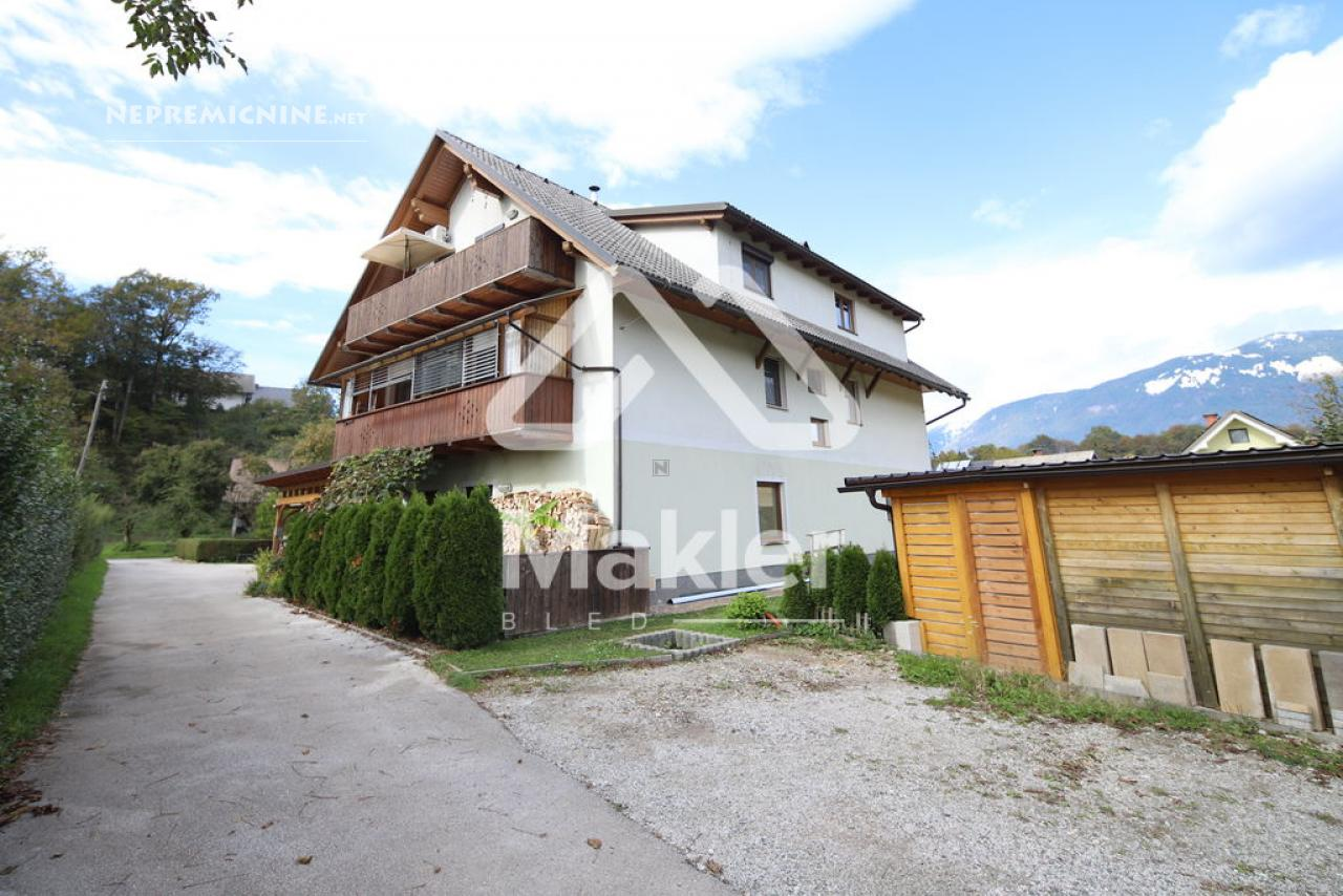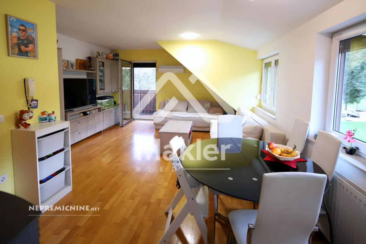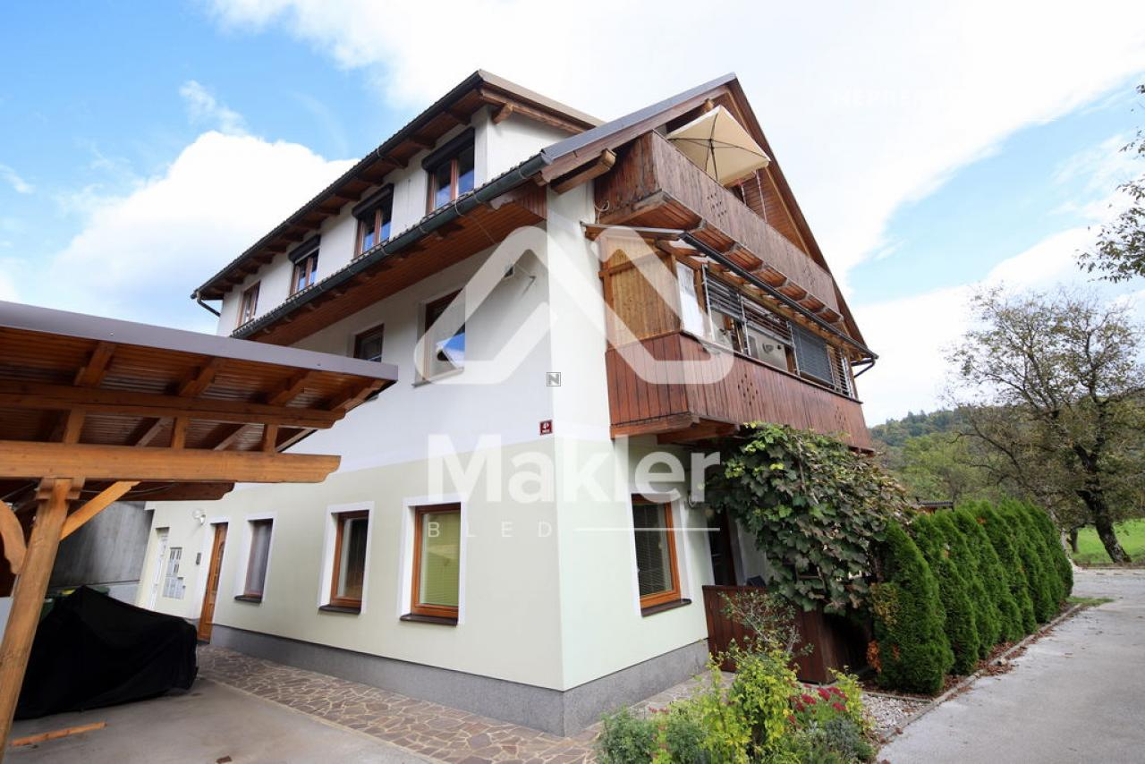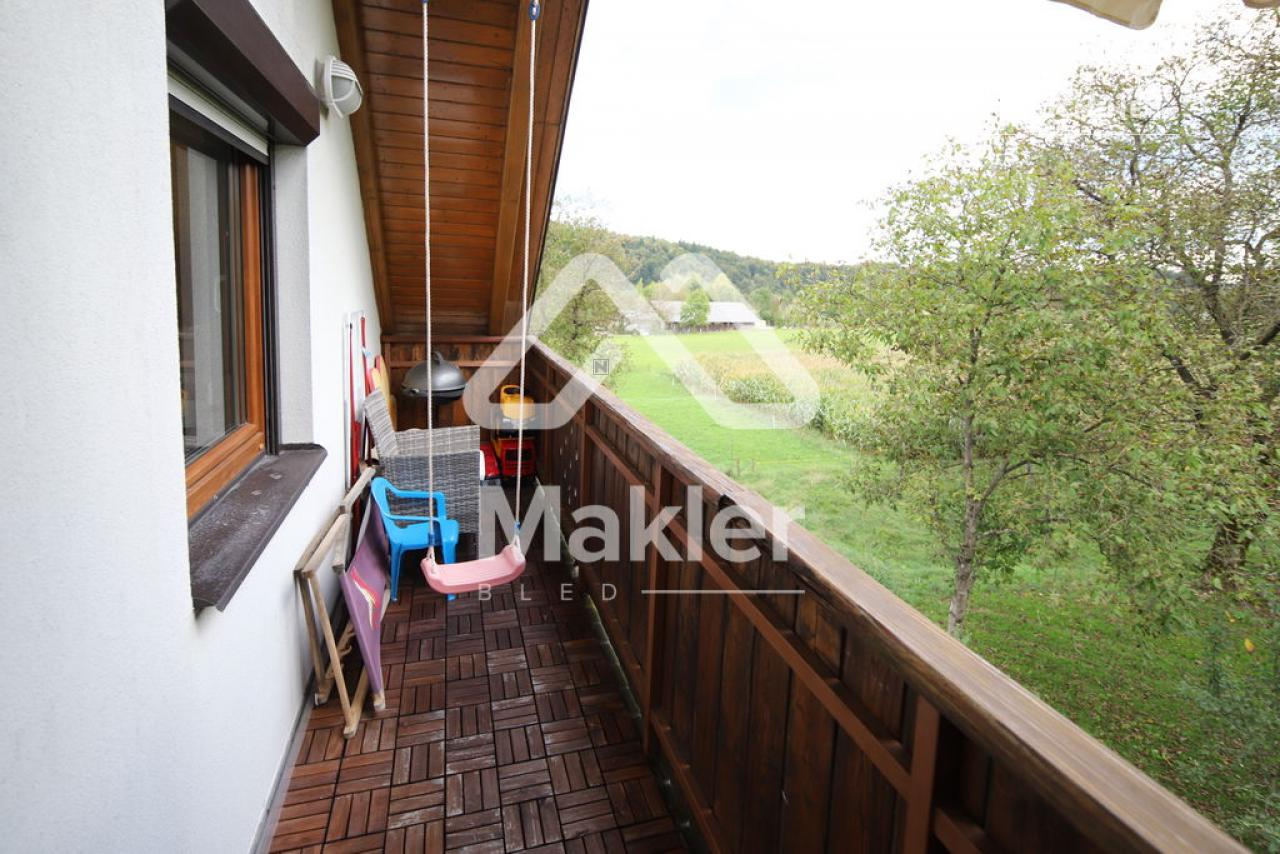 Dit prachtige 2,5-kamer appartement in Brezje, gelegen in de regio Gorenjska, biedt een unieke kans voor diegenen die op zoek zijn naar een rustige en zonnige woonomgeving. Het appartement bevindt zich in een gebouw met slechts vijf wooneenheden, gebouwd in 2008 met hoogwaardige klassieke bouwmaterialen. Het appartement is gelegen op de bovenste verdieping, wat zorgt voor een prachtig uitzicht op de omgeving. Het beschikt over een ruime woonkamer met veel natuurlijk licht, een keuken, eetkamer, en een zonnig balkon. Er zijn twee slaapkamers, een kinderkamer en een badkamer. Het appartement heeft ook een eigen tuin van 75 m², ideaal voor buitenactiviteiten en ontspanning. De locatie biedt gemakkelijke toegang tot de stad Radovljica, met tal van recreatiemogelijkheden en voorzieningen in de buurt. Het appartement is voorzien van een airconditioningsysteem en een houtkachel voor verwarming. Een eigen parkeerplaats onder een houten carport is inbegrepen. Dit appartement is perfect voor een gezin dat op zoek is naar een comfortabele en praktische woonruimte in een prachtige natuurlijke omgeving.
