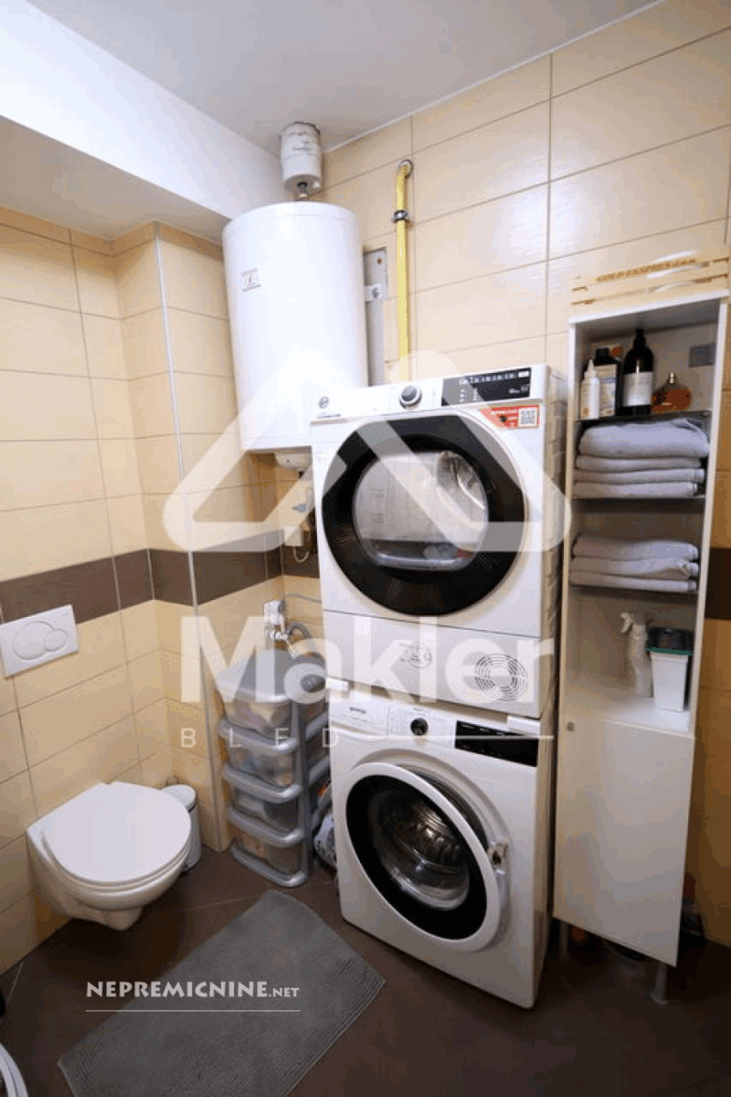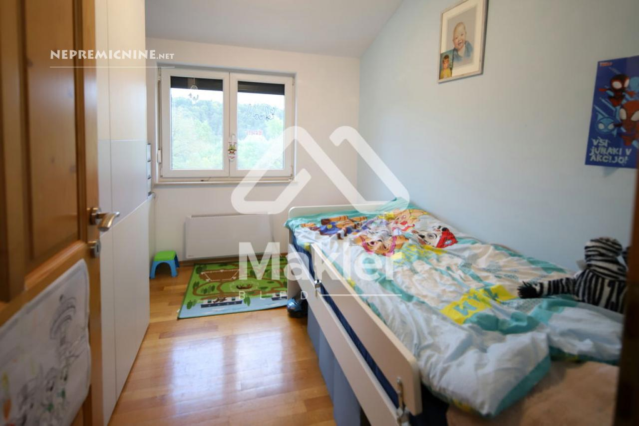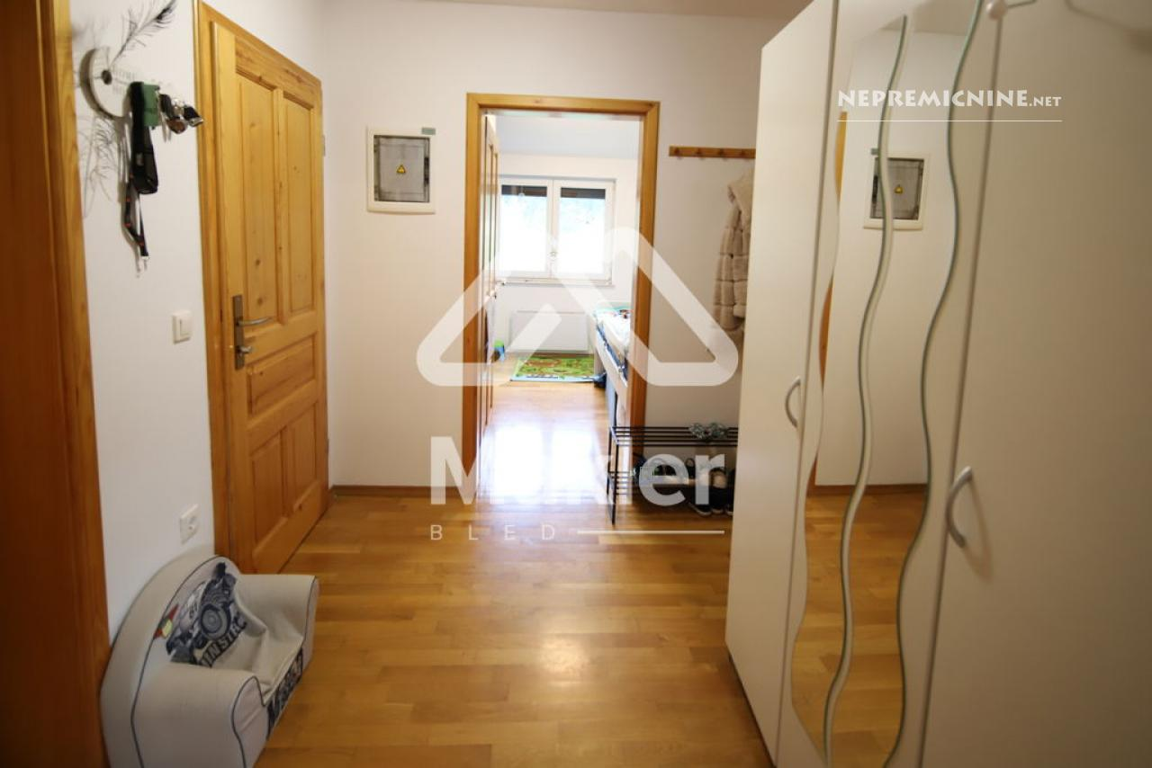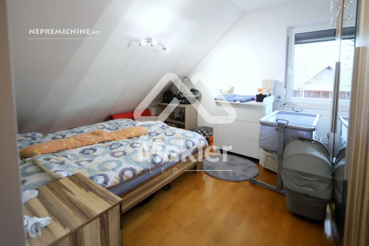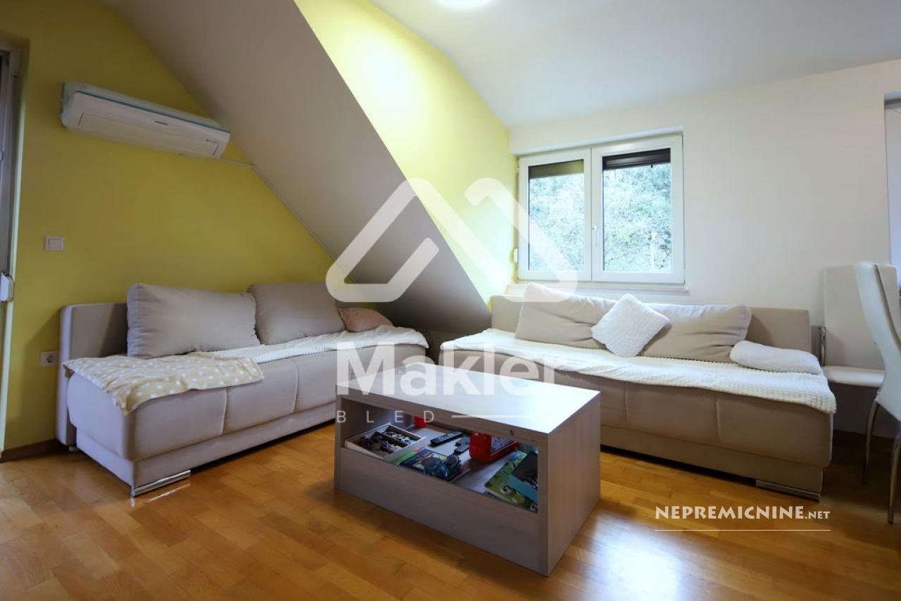 Dit prachtige 2,5-kamer appartement in Brezje, gelegen in de regio Gorenjska, biedt een unieke kans voor diegenen die op zoek zijn naar een rustige en zonnige woonomgeving. Het appartement bevindt zich in een gebouw met slechts vijf wooneenheden, gebouwd in 2008 met hoogwaardige klassieke bouwmaterialen. Het appartement is gelegen op de bovenste verdieping, wat zorgt voor een prachtig uitzicht op de omgeving. Het beschikt over een ruime woonkamer met veel natuurlijk licht, een keuken, eetkamer, en een zonnig balkon. Er zijn twee slaapkamers, een kinderkamer en een badkamer. Het appartement heeft ook een eigen tuin van 75 m², ideaal voor buitenactiviteiten en ontspanning. De locatie biedt gemakkelijke toegang tot de stad Radovljica, met tal van recreatiemogelijkheden en voorzieningen in de buurt. Het appartement is voorzien van een airconditioningsysteem en een houtkachel voor verwarming. Een eigen parkeerplaats onder een houten carport is inbegrepen. Dit appartement is perfect voor een gezin dat op zoek is naar een comfortabele en praktische woonruimte in een prachtige natuurlijke omgeving.