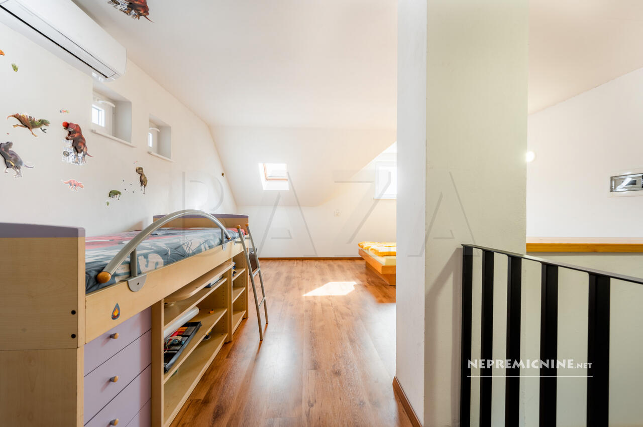 De begane grond herbergt een charmant studio-appartement met een volledig uitgeruste keuken en een badkamer met douche. De bovenverdieping, bereikbaar via een trap, biedt een prachtig atrium, een garderobe, een volledig uitgeruste keuken met een oven op werkhoogte, een woonkamer met een slaapbank, en een badkamer met douche. De bovenste verdieping heeft een ruime slaapkamer met een balkon dat een adembenemend uitzicht biedt op de omliggende bergen en het vliegveld.