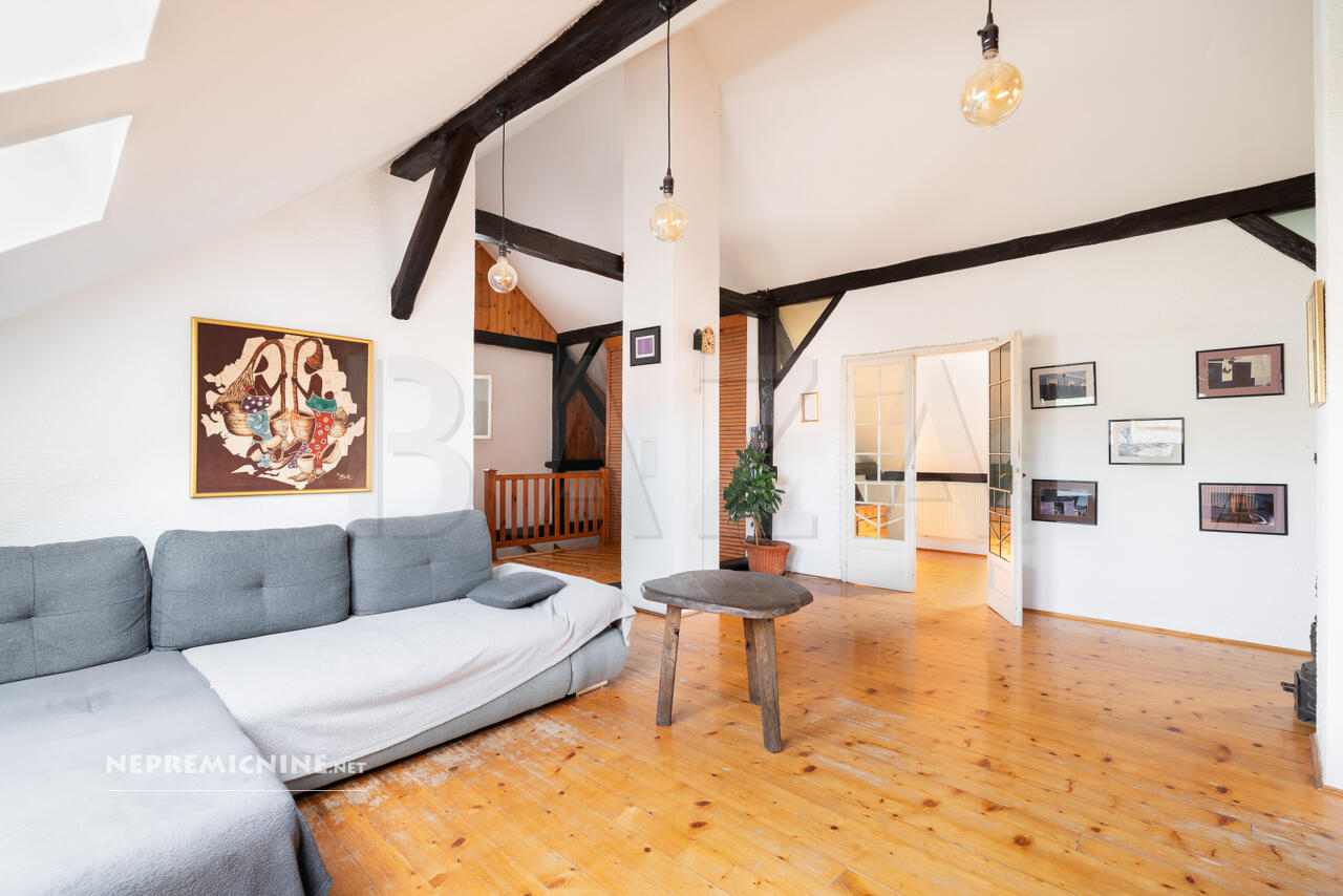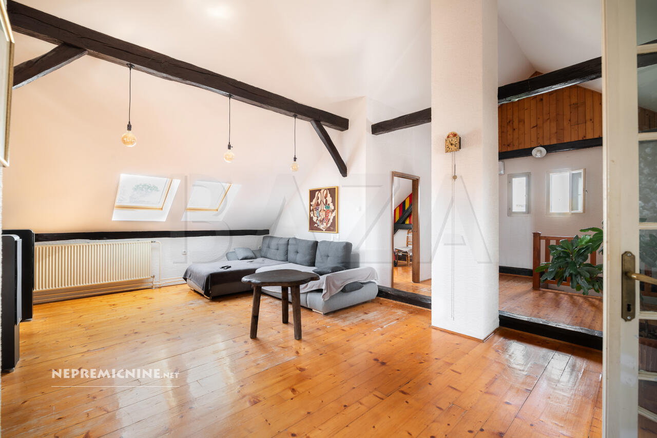De woning beschikt over drie slaapkamers, een badkamer, een aparte WC, en een kelder van 30 m². Het gelijkvloers is momenteel ingericht als een huurappartement, maar kan eenvoudig worden omgebouwd tot een commerciële ruimte zoals een winkel of kantoor. De hoge zolderverdieping biedt een stijlvol ingerichte woonruimte met een ruime keuken, eetkamer, woonkamer, badkamer, slaapkamer en een studeerkamer.