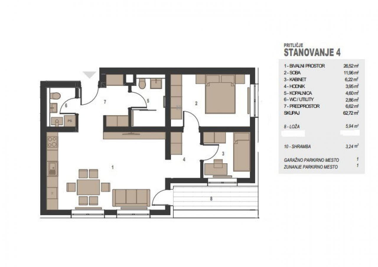 Dit prachtige nieuwbouwappartement in de residentie Vile Kajuhova biedt een unieke kans om te wonen in een rustige omgeving, dicht bij de natuur en het stadscentrum van Slovenske Konjice. Gelegen aan de Prežihova ulica, nabij het kasteel Trebnik, biedt deze locatie gemakkelijke toegang tot een kinder- en sportveld, basisschool, muziekschool, en het gymnasium van Slovenske Konjice. Het middeleeuwse stadscentrum, de markt en het busstation zijn op korte afstand, evenals belangrijke voorzieningen zoals banken, postkantoor en gemeentehuis. De snelweg is slechts 6 km verwijderd. Het appartement beschikt over een ruime woonkamer met keuken, eetkamer en toegang tot een terras, twee slaapkamers, een badkamer, een apart toilet, een berging en een parkeerplaats in de garage. De hoogwaardige afwerking omvat parketvloeren, driedubbele beglazing met elektrische zonwering, en brandwerende voordeuren. De bouw is duurzaam en aardbevingsbestendig, met premium materialen. De verwachte oplevering is in 2025.