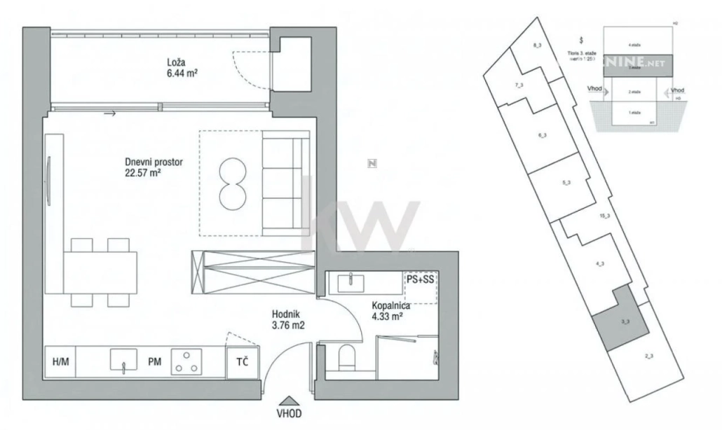 Ontdek deze exclusieve garsonjera in het nieuwbouwproject TRŽAŠKA LIVING, gelegen in het hart van Ljubljana Vič. Deze moderne woning, die in maart 2027 wordt opgeleverd, biedt een hoogwaardige woonervaring met een oppervlakte van 59 m². De garsonjera bevindt zich op de eerste verdieping en is georiënteerd op het zuidwesten, wat zorgt voor veel natuurlijk licht. De woning beschikt over een slaap-woonruimte met keuken en eetkamer, een badkamer en een loggia. Daarnaast is er een ruime berging in de kelder en een overdekte parkeerplaats. Het gebouw is ontworpen met hoogwaardige materialen en voldoet aan strenge energie-efficiëntie-eisen, waaronder een warmtepomp voor verwarming en warm water, vloerverwarming en driedubbele beglazing. De locatie biedt gemakkelijke toegang tot lokale voorzieningen zoals winkels en restaurants, en is goed verbonden met het openbaar vervoer. Ljubljana Vič is een levendige wijk met een rijke geschiedenis en biedt tal van recreatieve mogelijkheden, waaronder nabijgelegen parken en culturele bezienswaardigheden.