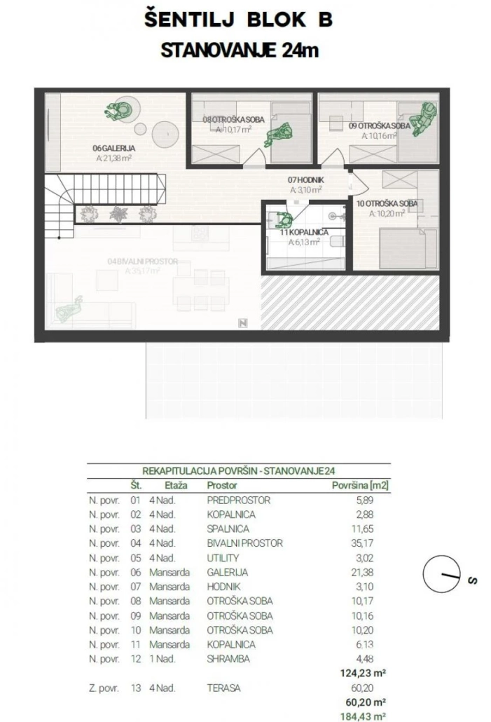 Dit prachtige nieuwbouwappartement in Šentilj v Slovenskih Goricah biedt een unieke kans voor investeerders en kopers die op zoek zijn naar een ruim en modern huis. Gelegen op slechts 15 km van Maribor en dicht bij de grens met Oostenrijk, biedt deze locatie een uitstekende verbinding met de stad en de omliggende regio. Het appartement van 195,34 m² beschikt over een groot terras, vier slaapkamers, twee badkamers en een ruime woonkamer met open keuken. De moderne architectuur en grote glazen oppervlakken zorgen voor veel natuurlijk licht en een prachtig uitzicht. Het gebouw is energiezuinig met vloerverwarming en een gemeenschappelijke zonne-energie-installatie op het dak. Nabijgelegen voorzieningen zoals scholen, winkels, en openbaar vervoer zijn binnen 400 meter bereikbaar. De regio Podravska staat bekend om zijn prachtige natuur en biedt tal van recreatiemogelijkheden, waaronder wandel- en fietspaden. Dit appartement is ideaal voor gezinnen en investeerders die willen profiteren van de groeiende populariteit van de regio.