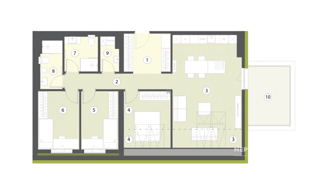 Ontdek het moderne leven in het hart van Kamnik met dit prachtige vierkamerappartement in het Kamniški Biser complex. Dit nieuwbouwproject, gelegen tussen Knafličev prehod, Usnjarska en Parmova ulica, biedt een harmonieuze mix van moderne architectuur, groene ruimtes en hoogwaardige afwerking. Het appartement van 121,7 m² is ontworpen met oog voor comfort en functionaliteit, en beschikt over een ruime woonkamer, een volledig uitgeruste keuken, drie slaapkamers en twee badkamers. Geniet van de zon op uw eigen terras van 12,3 m², met een oriëntatie op het zuidoosten en noordoosten. Het complex biedt tal van voorzieningen zoals een ondergrondse garage, een gemeenschappelijke tuin en een kinderspeelplaats. Kamnik, gelegen in de regio Ljubljana-okolica, is een charmante stad met een rijke geschiedenis en biedt gemakkelijke toegang tot winkels, restaurants en openbaar vervoer. De regio staat bekend om zijn prachtige natuur en toeristische attracties zoals het Velika Planina bergplateau en de Kamniška Bistrica vallei. Dit appartement is ideaal voor gezinnen die op zoek zijn naar een comfortabele en moderne leefomgeving. De bouw wordt naar verwachting voltooid in de herfst van 2027.