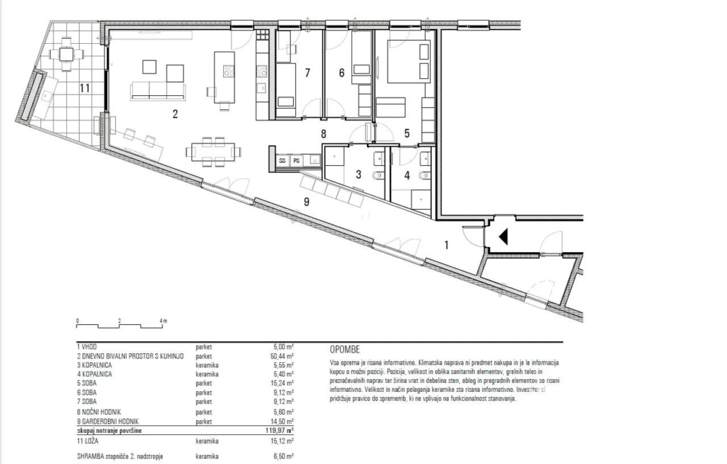 Dit prachtige 4-kamer appartement van 120 m² is gelegen in de gewilde wijk Bežigrad in Ljubljana. Het appartement maakt deel uit van het moderne Soči Park II project, dat hoogwaardige materialen en een eigentijdse architectuur biedt. De woning beschikt over een ruime woonkamer met open keuken en eetkamer van 50 m², drie slaapkamers, twee badkamers, een apart toilet, en een balkon van 15 m² dat ideaal is voor een buitenkeuken. Extra opslagruimte van 6,5 m² is beschikbaar naast het appartement. Het gebouw is voorzien van een lift, vloerverwarming, airconditioning, en een eigen parkeerplaats in de garage. De ligging biedt een uitstekende verbinding met het openbaar vervoer en nabijgelegen voorzieningen zoals winkels en restaurants. De regio Ljubljana staat bekend om zijn rijke culturele erfgoed en toeristische attracties zoals het kasteel van Ljubljana en Tivoli Park. De oplevering van het appartement is gepland voor de lente van 2026.