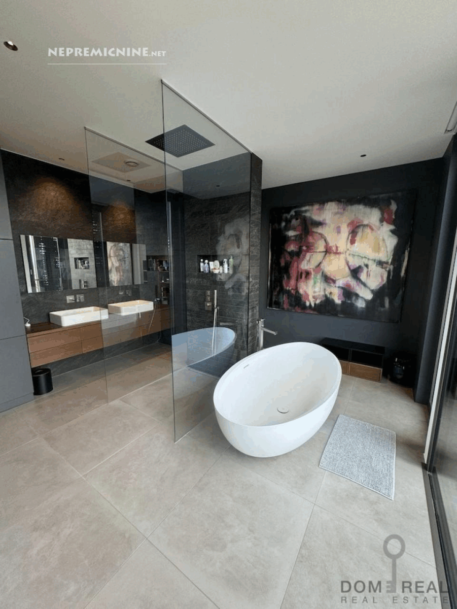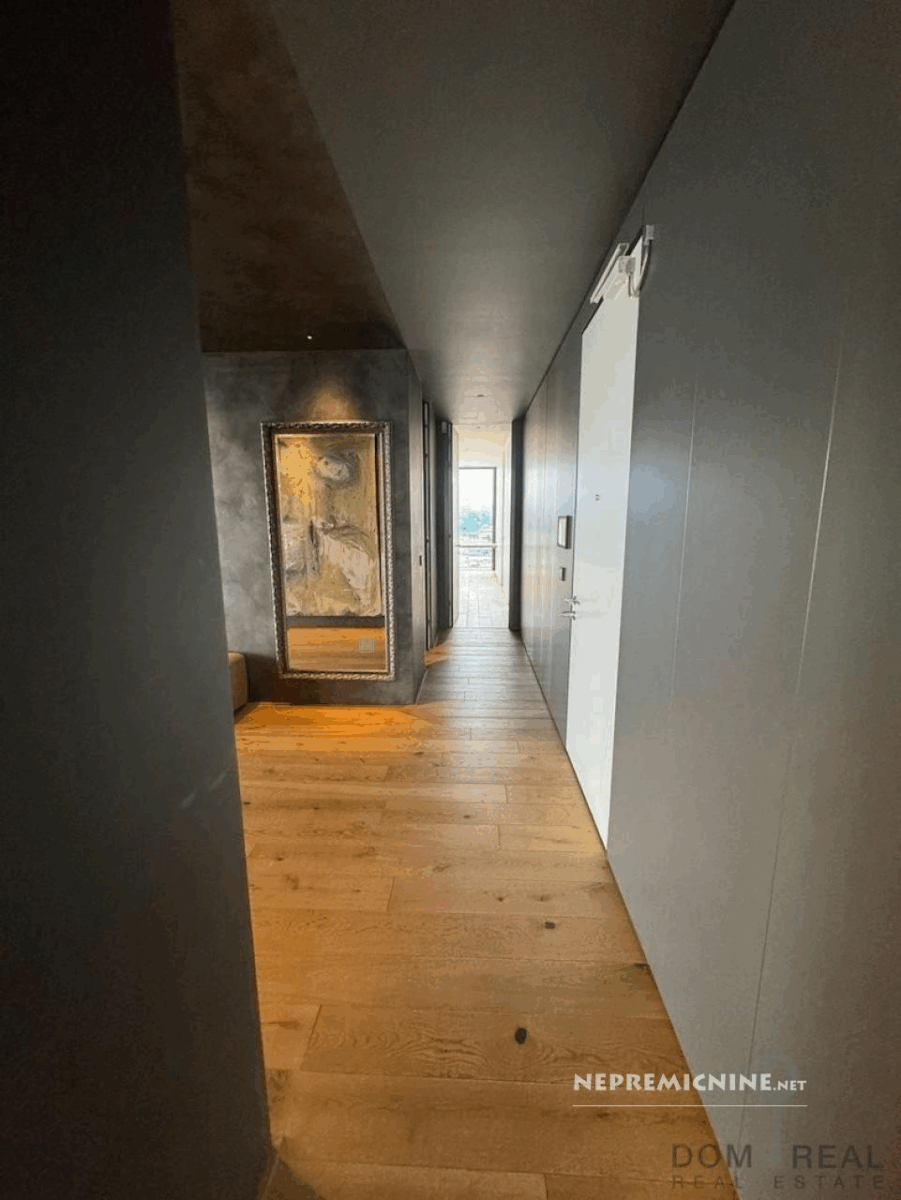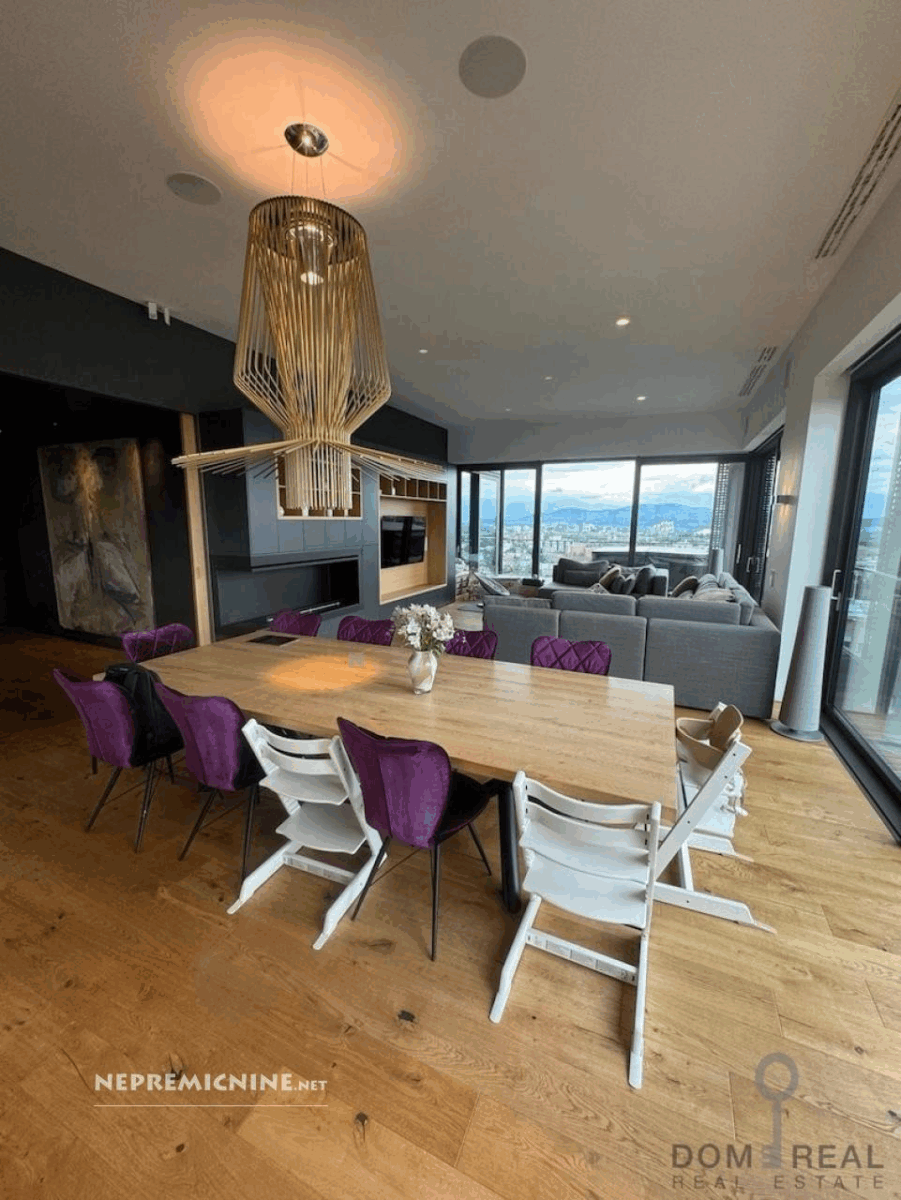 Met een royale oppervlakte van 326,3 m², beschikt het over glazen panoramische wanden, hoge plafonds en een terras rondom het hele appartement. De woning is uitgerust met hoogwaardige materialen en biedt moderne voorzieningen zoals vloerverwarming, centrale ventilatie en slimme installaties.