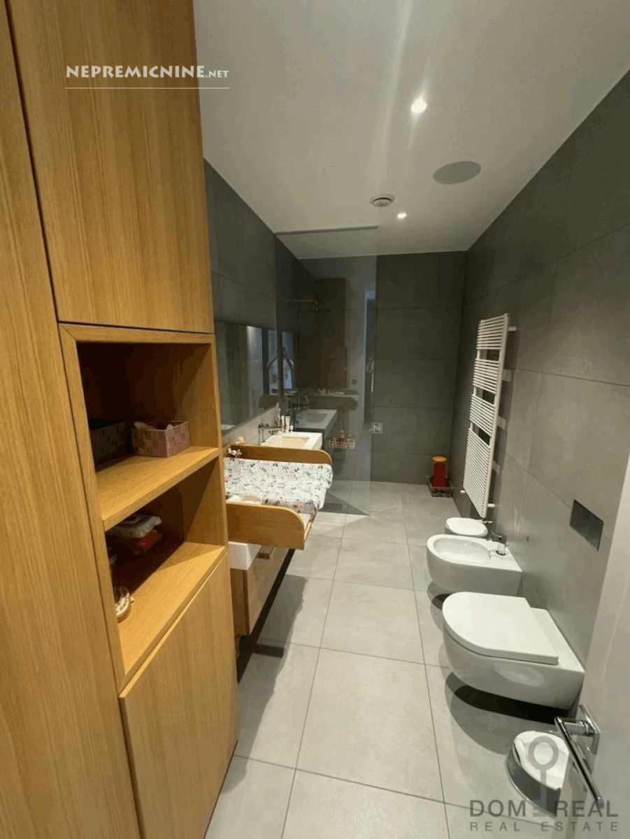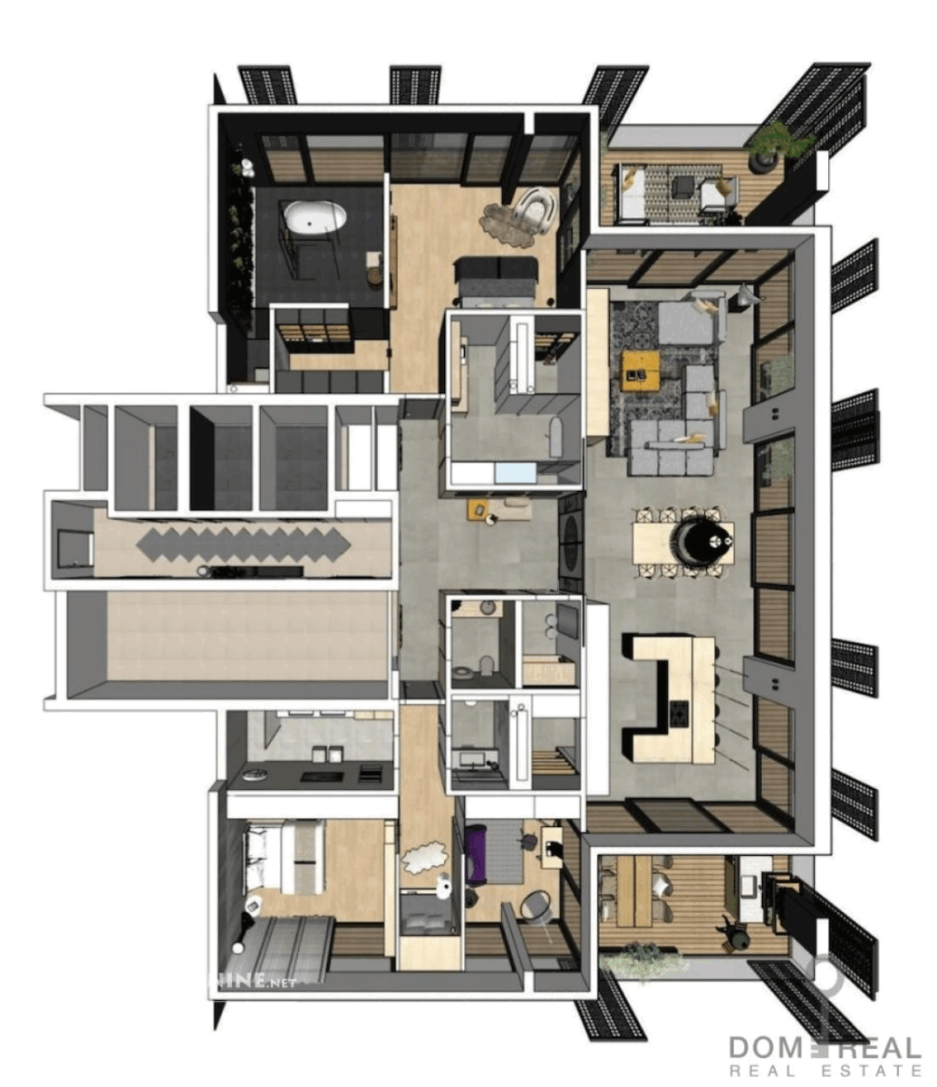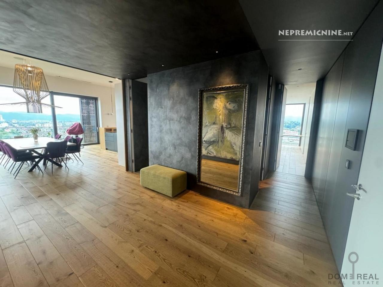 Met een royale oppervlakte van 326,3 m², beschikt het over glazen panoramische wanden, hoge plafonds en een terras rondom het hele appartement. De woning is uitgerust met hoogwaardige materialen en biedt moderne voorzieningen zoals vloerverwarming, centrale ventilatie en slimme installaties.