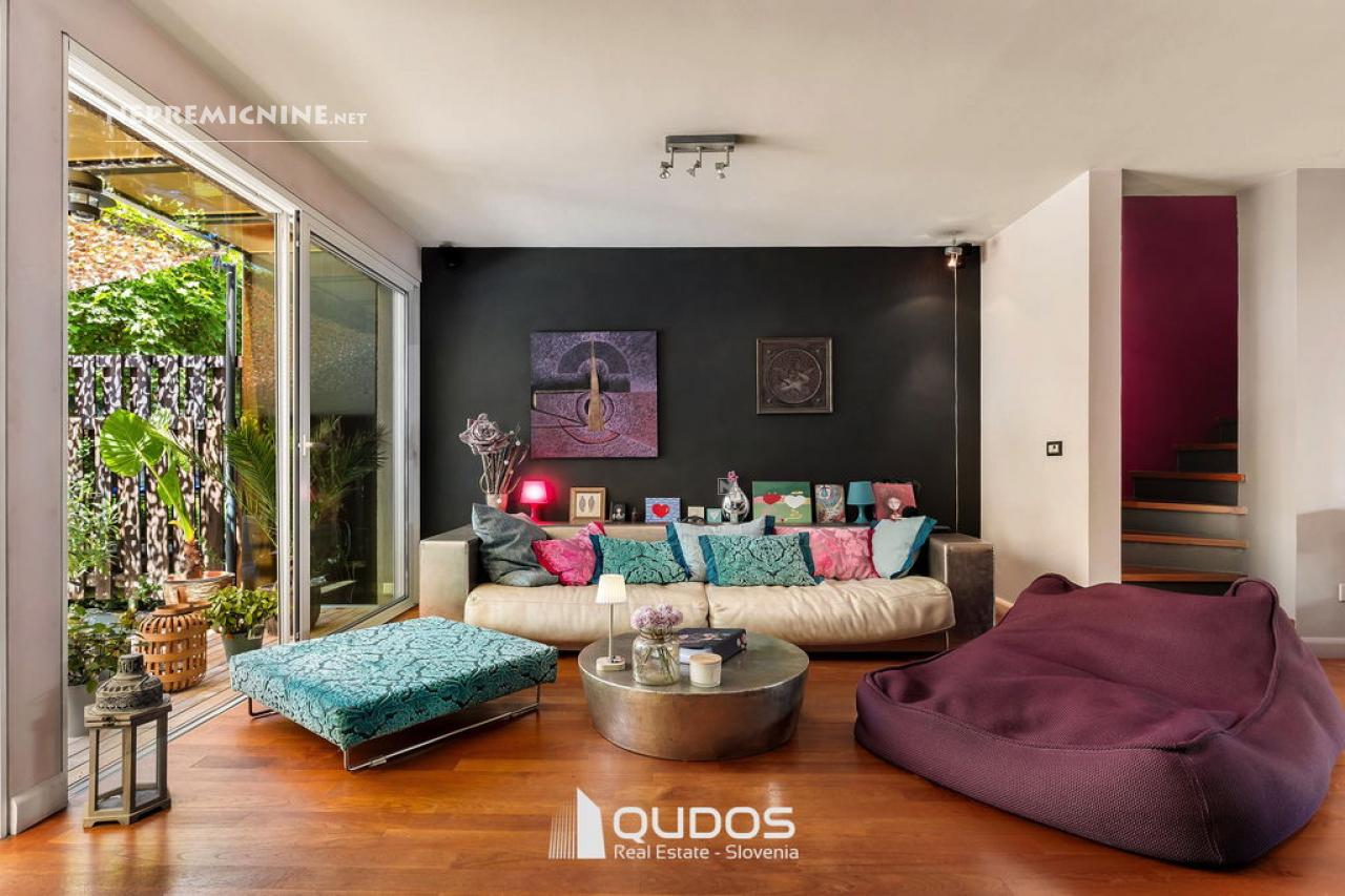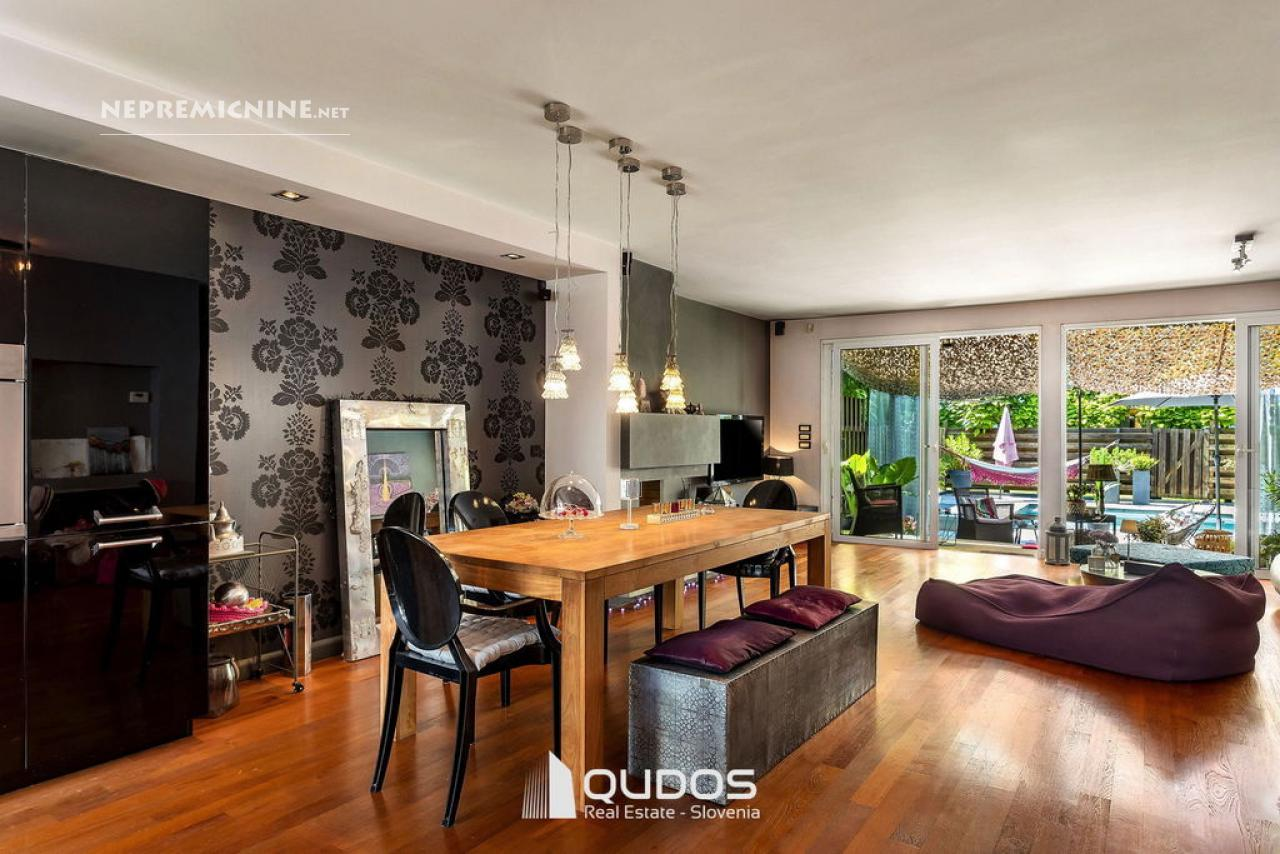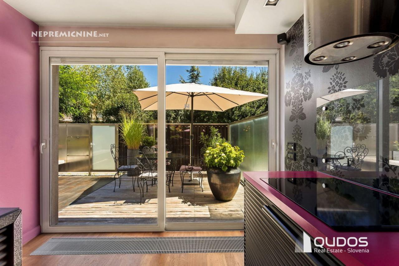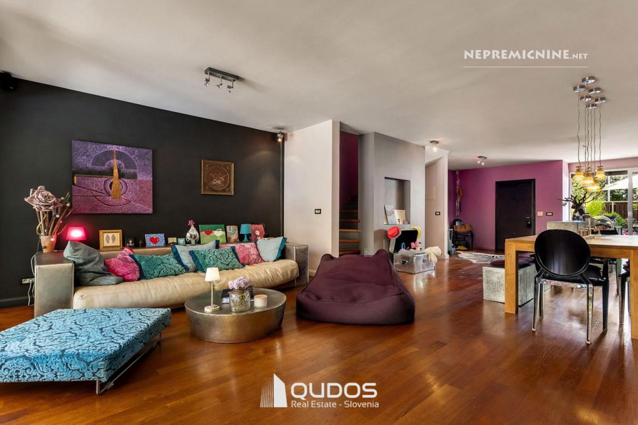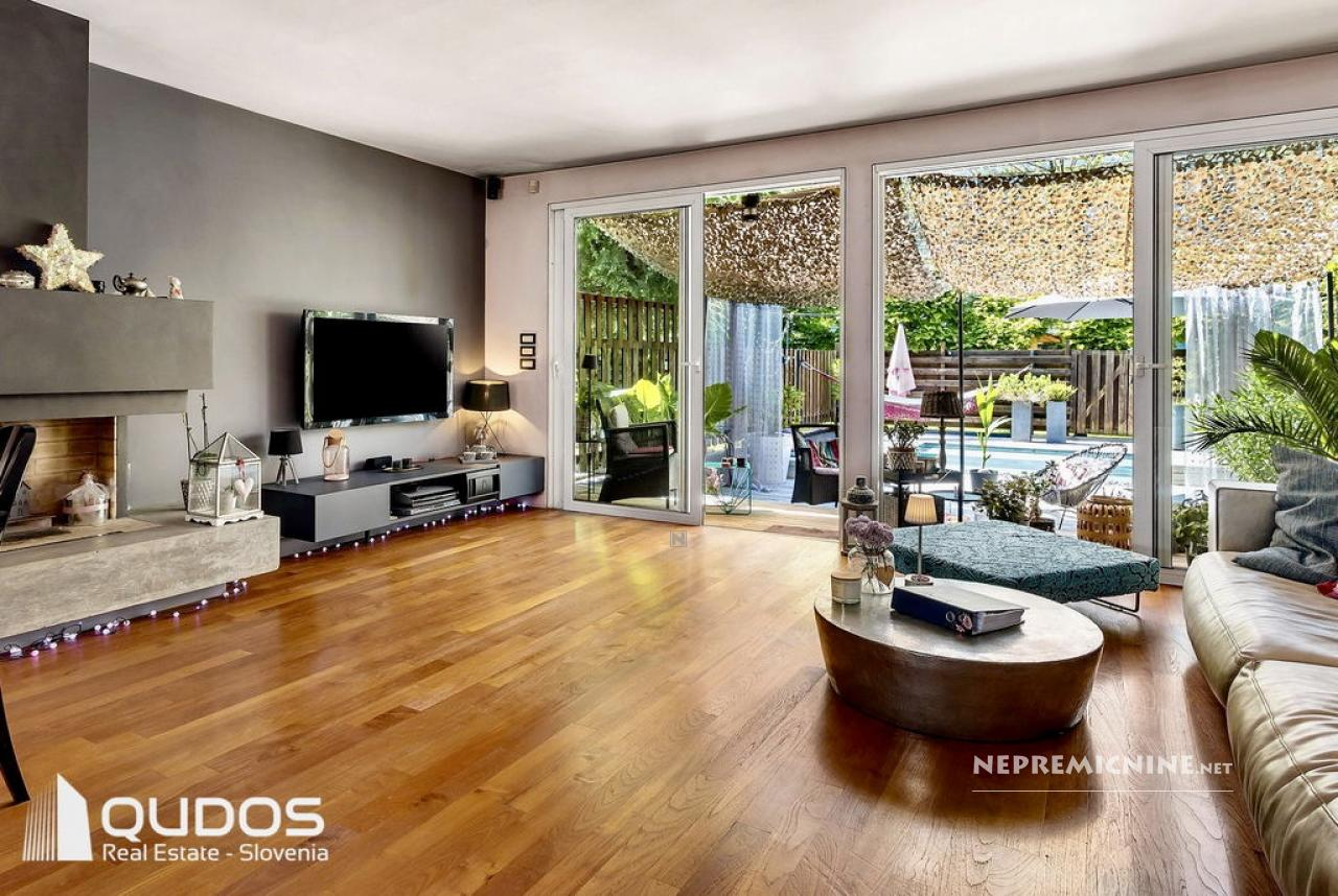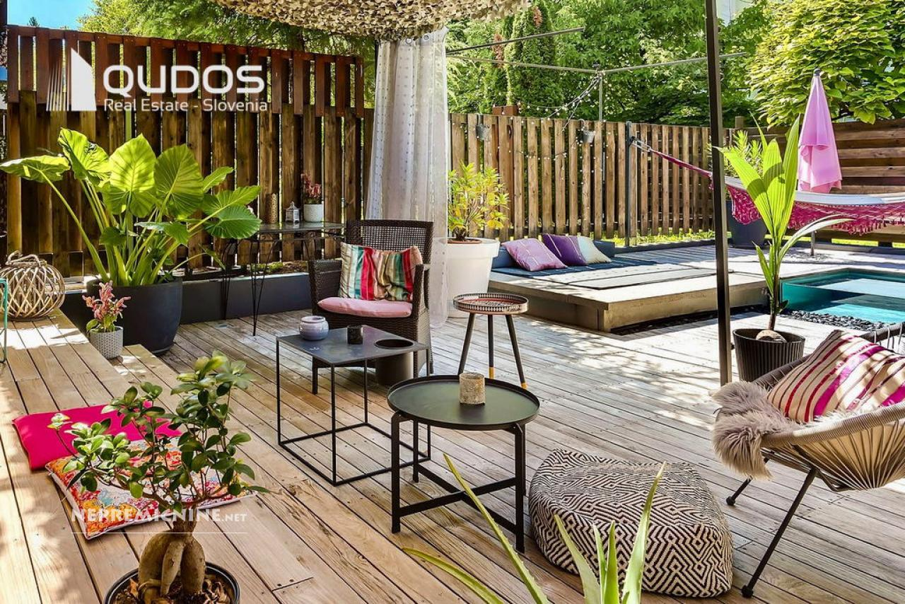 Dit prachtige rijtjeshuis, gelegen in de gewilde wijk Mostec nabij Koseški Bajer, biedt een unieke combinatie van modern design en natuurlijke schoonheid. Met een woonoppervlakte van 202,6 m² en een perceel van 165 m², is deze woning een oase van rust en luxe. De woning is gebouwd in 2006 en beschikt over twee ruime slaapkamers, drie badkamers en een indrukwekkende open leefruimte die naadloos overgaat in twee prachtige terrassen. De westelijke terras is een zen-oase met houten vloeren, weelderige planten en een klein zwembad, perfect voor ontspanning. De oostelijke terras biedt een intieme setting voor ochtendkoffie of avondwijn. De woning is volledig uitgerust met vloerverwarming, een centraal stofzuigsysteem en een Bose-geluidssysteem. De nabijheid van de natuur, zoals de Rožnik-heuvel en talrijke wandelpaden, maakt het een ideale locatie voor natuurliefhebbers. Bovendien ligt het op slechts 3 km van het centrum van Ljubljana en 2 km van de ringweg, waardoor het een uitstekende keuze is voor diegenen die zowel rust als stedelijke voorzieningen willen. In de buurt vindt u diverse winkels, restaurants en uitstekende vervoersverbindingen.