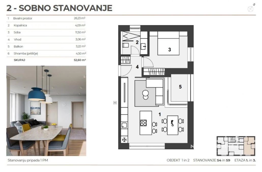 Dit moderne 2-kamer appartement, gelegen in het rustige en zonnige Podčetrtek, biedt een unieke kans voor zowel investeerders als mensen die op zoek zijn naar een vakantiehuis. Het appartement maakt deel uit van het nieuwe woonproject ‘Rezidenca Podčetrtek’ en bevindt zich op de derde verdieping. Met een netto oppervlakte van 52,6 m² en een balkon van 3,22 m², biedt het appartement een ruime en lichte leefruimte. De grote glazen oppervlakken zorgen voor veel natuurlijk licht, terwijl de hoogwaardige bouwmaterialen zorgen voor uitstekende geluidsisolatie en energie-efficiëntie. Het appartement beschikt over vloerverwarming, een eigen warmtepomp en de mogelijkheid om het om te bouwen tot een smart home. De locatie is ideaal voor natuurliefhebbers, met tal van fiets- en wandelpaden in de buurt, evenals de beroemde Terme Podčetrtek. Het biedt ook gemakkelijke toegang tot lokale voorzieningen en openbaar vervoer, waardoor het een perfecte keuze is voor zowel permanente bewoning als vakantieverhuur.