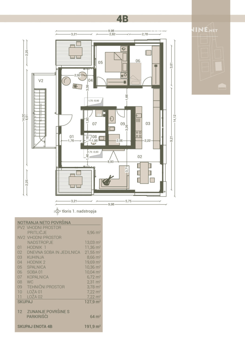Ontdek de perfecte balans tussen modern comfort en natuurlijke schoonheid in deze prachtige driekamerwoning in Bizovik. Gelegen in het rustige en groene Vis-a-Vis project, biedt deze woning een unieke kans voor gezinnen die op zoek zijn naar ruimte, licht en een nauwe band met de natuur. Met een totale oppervlakte van 191,9 m², waarvan 127,9 m² woonruimte en 64 m² aan buitenruimtes, is dit appartement ideaal voor wie houdt van een moderne levensstijl. Geniet van de voordelen van twee terrassen, vloerverwarming en de mogelijkheid om de zolder aan te passen voor extra woonruimte. De woning is gelegen op slechts 5 km van het centrum van Ljubljana, waardoor u kunt genieten van de rust van de natuur zonder in te boeten op stedelijke voorzieningen. Bizovik biedt een veilige en vriendelijke omgeving met gemakkelijke toegang tot winkels, restaurants en openbaar vervoer. Mis deze beperkte kans niet om uw droomhuis te reserveren in een van de tien exclusieve eenheden van het Vis-a-Vis project.