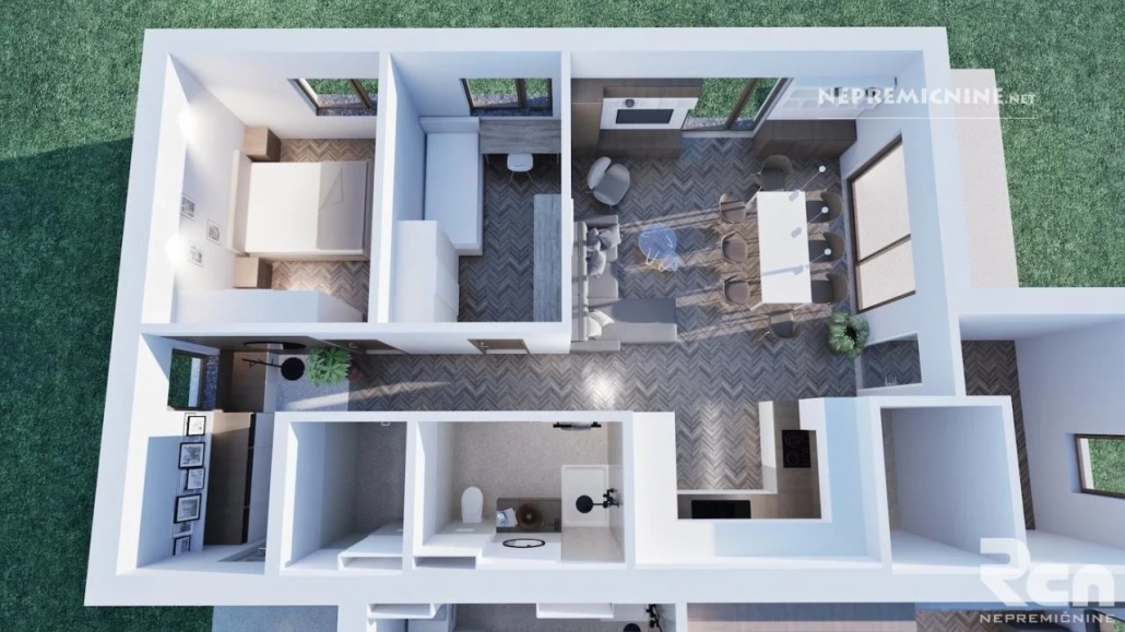 Ontdek het moderne en energiezuinige wonen in het rustige Turnišče met dit prachtige 3,5-kamer appartement. Gelegen in het project ‘Hiše Pasike’, biedt deze woning een eigentijdse architectuur met duurzame oplossingen. Het appartement beschikt over een netto woonoppervlakte van 77 m², een terras van 13,24 m² en een eigen tuin van 169 m². De indeling omvat een ruime woonkamer met keuken, een hoofdslaapkamer, een extra kamer, een kantoor met toegang tot het terras, een badkamer en aparte sanitaire voorzieningen. De woning is gebouwd met hoogwaardige materialen zoals drievoudig PVC-glas, eiken parket en keramiek in de sanitaire ruimtes. Voorzien van een warmtepomp en vloerverwarming, biedt het appartement optimaal comfort. In de buurt vindt u winkels, scholen, een kleuterschool, een gezondheidscentrum en een bushalte. Murska Sobota ligt op slechts 17 km afstand. Geniet van de nabijheid van lokale voorzieningen en de rustige omgeving van Pomurska.
