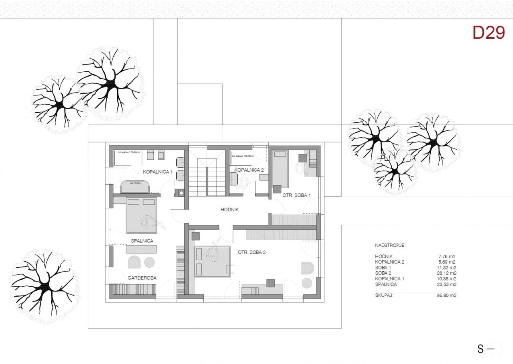 Ontdek deze moderne en nieuw gebouwde vrijstaande woning in het rustige dorpje Rakovnik, gelegen in de buurt van Medvode, slechts 8 kilometer van Ljubljana. Deze woning biedt een perfecte balans tussen stedelijke nabijheid en landelijke rust, omgeven door bossen en open landbouwgrond met uitzicht op de Kamniško-Savinjské Alpen. De woning is ideaal voor gezinnen, met een veilige omgeving en nabijheid van scholen, winkels en openbaar vervoer. De woning beschikt over een ruime woonoppervlakte van 173 m², verdeeld over twee verdiepingen, met vier slaapkamers en twee badkamers. De moderne architectuur met grote glazen oppervlakken zorgt voor veel natuurlijk licht en een naadloze verbinding tussen binnen en buiten. Hoogwaardige afwerkingen zoals eiken parket, keramiek en sanitair van topkwaliteit maken deze woning compleet. De woning is energiezuinig met vloerverwarming en een warmtepomp, en biedt slimme installaties voor comfort en veiligheid. Geniet van de nabijheid van recreatiegebieden en de gemakkelijke toegang tot de stad Ljubljana.