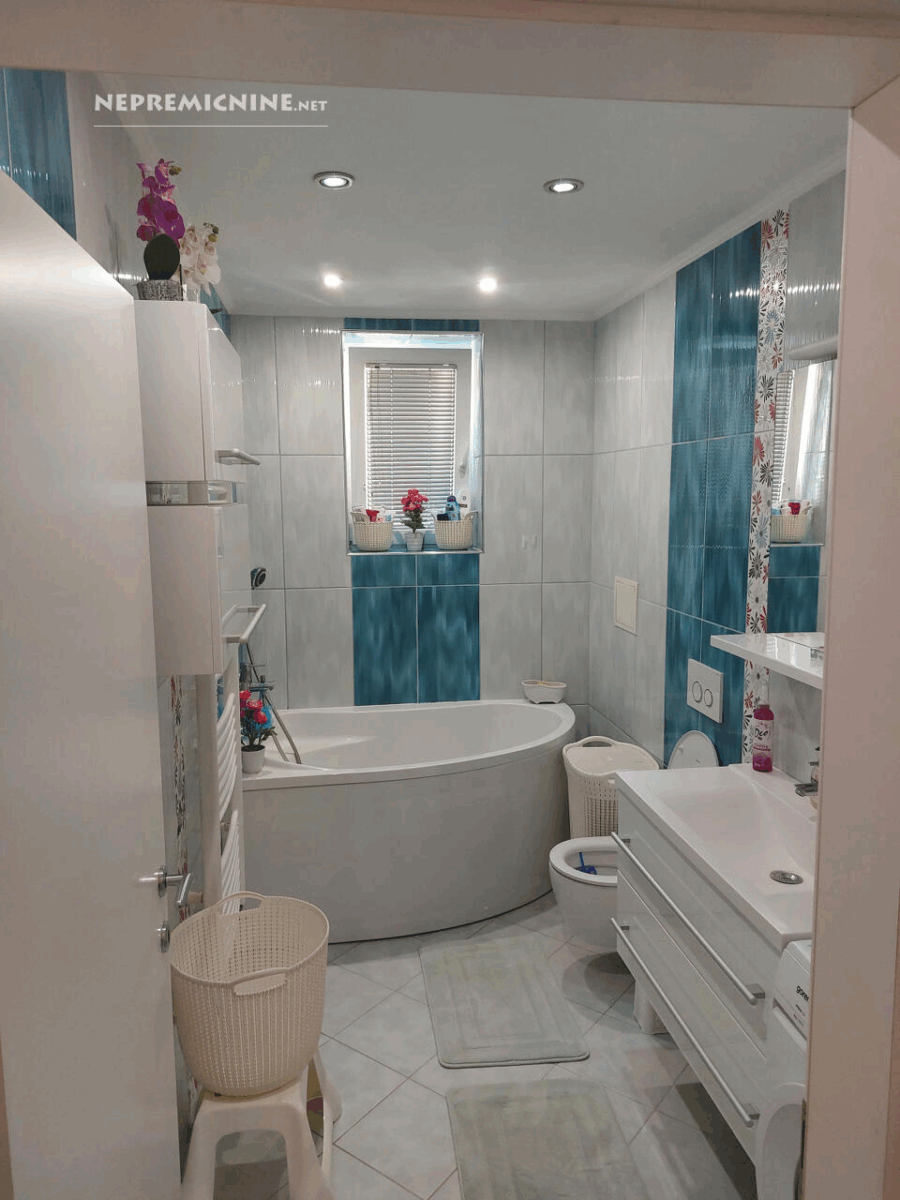 Op de eerste verdieping leidt een lichte gang met uitgang naar het balkon. De hoofdslaapkamer is ruim en luchtig ontworpen, met een raam en uitgang naar het balkon. In de slaapkamer bevinden zich ook een garderoberuimte en een eigen badkamer – de totale oppervlakte bedraagt bijna 25 m². Vanuit de gang is er toegang tot twee kinderkamers, georiënteerd op de zonnige kant, elk ongeveer 12 m² groot. Op de verdieping is er ook een grotere familiebadkamer, verbonden met de wasruimte, met een totale oppervlakte van iets minder dan 11 m².