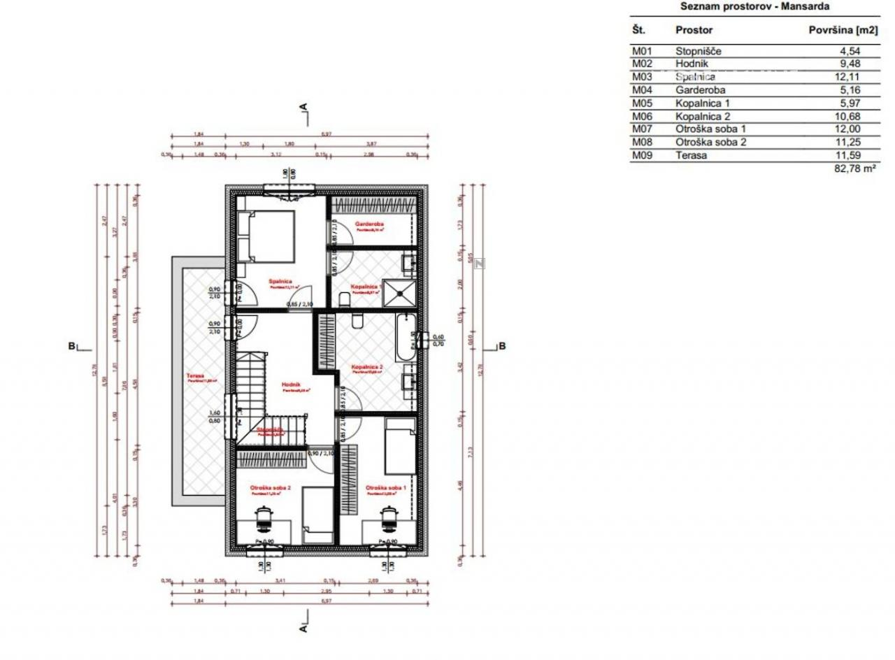 Op de eerste verdieping leidt een lichte gang met uitgang naar het balkon. De hoofdslaapkamer is ruim en luchtig ontworpen, met een raam en uitgang naar het balkon. In de slaapkamer bevinden zich ook een garderoberuimte en een eigen badkamer – de totale oppervlakte bedraagt bijna 25 m². Vanuit de gang is er toegang tot twee kinderkamers, georiënteerd op de zonnige kant, elk ongeveer 12 m² groot. Op de verdieping is er ook een grotere familiebadkamer, verbonden met de wasruimte, met een totale oppervlakte van iets minder dan 11 m².