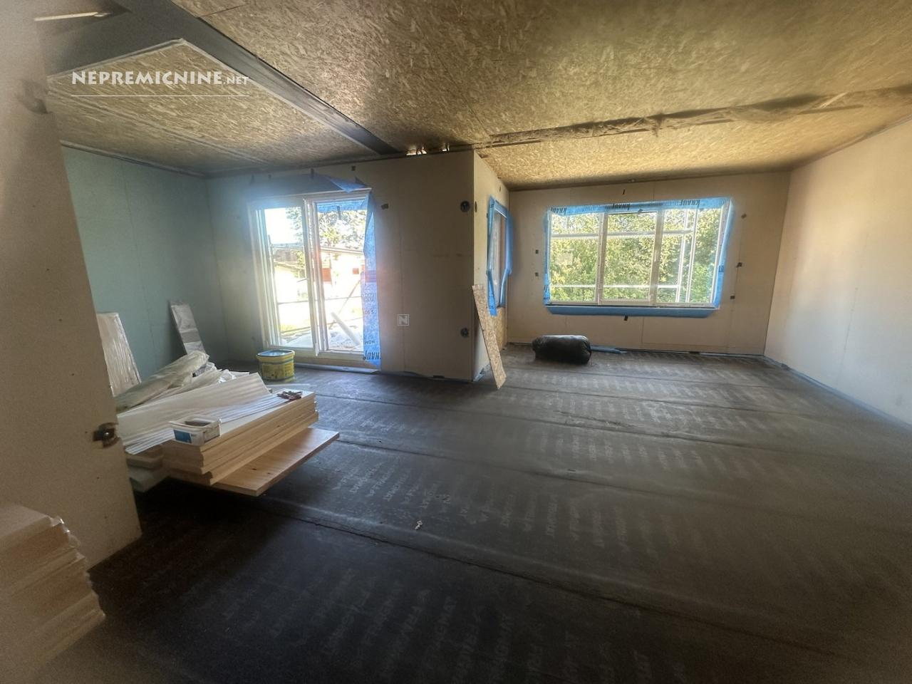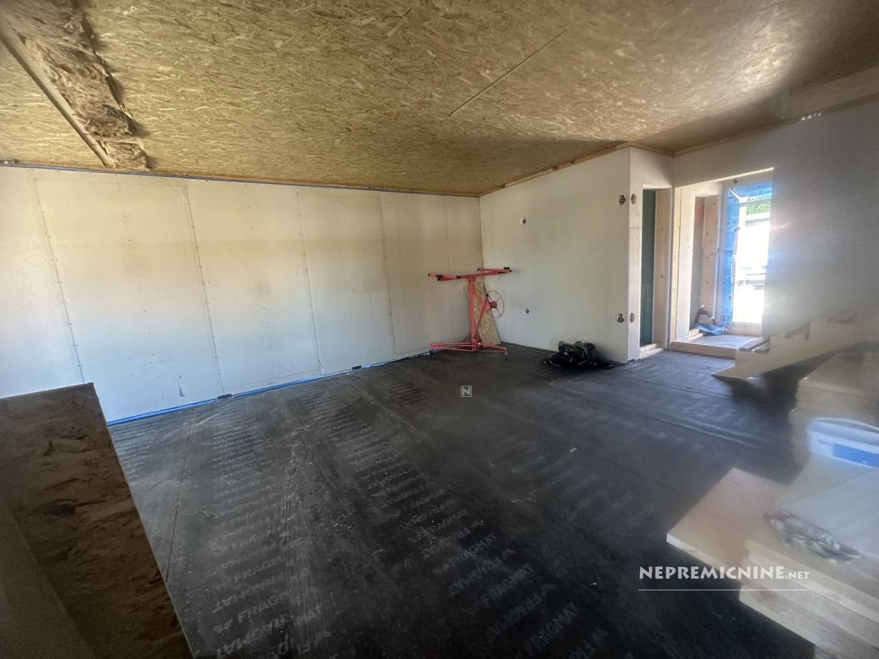 Het huis is zeer doordacht ontworpen, met een optimale indeling van ruimtes, veel licht en functionele oppervlakken. Op de begane grond bevindt zich een open woonkamer met keuken, eetkamer en woonkamer van in totaal 52 m², waar natuurlijk licht prachtig door de grote ramen stroomt. Vanuit de keuken is er toegang tot een berging en een directe uitgang naar het ruime terras, waar u uitzicht heeft op het groen en de natuur – een ideale gelegenheid voor het inrichten van een tuin, zwembad of zomerkeuken. Naast de woonkamer is er nog een klein toilet, bij de ingang een garderoberuimte. Rechts van de ingang bevindt zich een technische ruimte met warmtepomp, links een extra kamer die ideaal is voor een thuiskantoor, schoonheidshoek of extra opslag/garderobe.