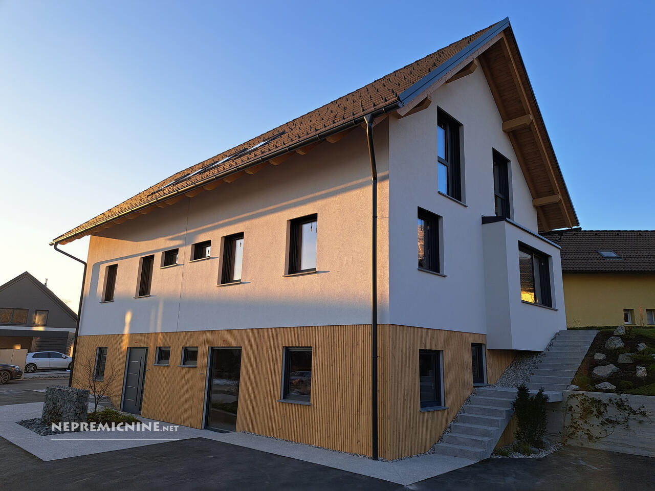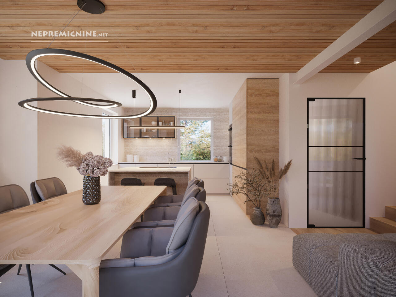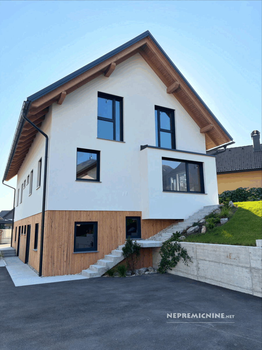 Ontdek deze moderne rijtjeshuis in Zgornja Bela, Preddvor, een nieuwbouwproject dat in 2024 wordt voltooid. Deze gezinswoning biedt een ruime woonoppervlakte van 147,3 m² en een perceel van 270,8 m². Geniet van een adembenemend uitzicht op de Storžič en de Kamniško-Savinjske Alpen. De woning is ontworpen met energie-efficiëntie in gedachten, met een energielabel A1, wat zorgt voor lage energiekosten en een milieuvriendelijke levensstijl. De open woonkamer baadt in natuurlijk licht en er is een grote terras voor ontspanning. De locatie biedt de rust van het platteland met snelle toegang tot Kranj (12 minuten), de snelweg (15 minuten) en Ljubljana (30 minuten). In de buurt vindt u scholen, winkels en prachtige natuur. Dit is een ideale kans voor gezinnen of investeerders die op zoek zijn naar een woning met een prachtig uitzicht en moderne voorzieningen.