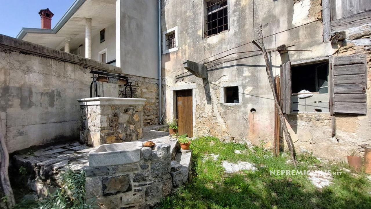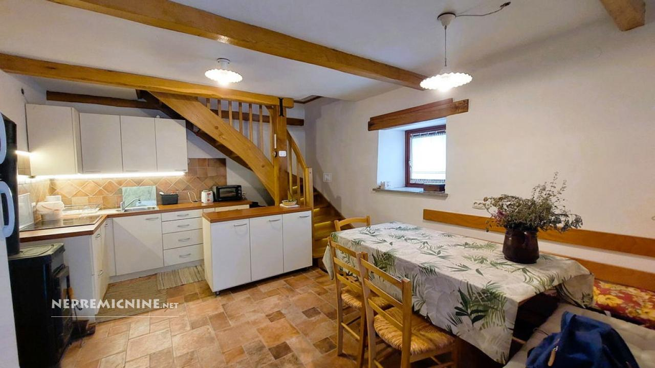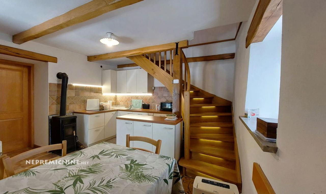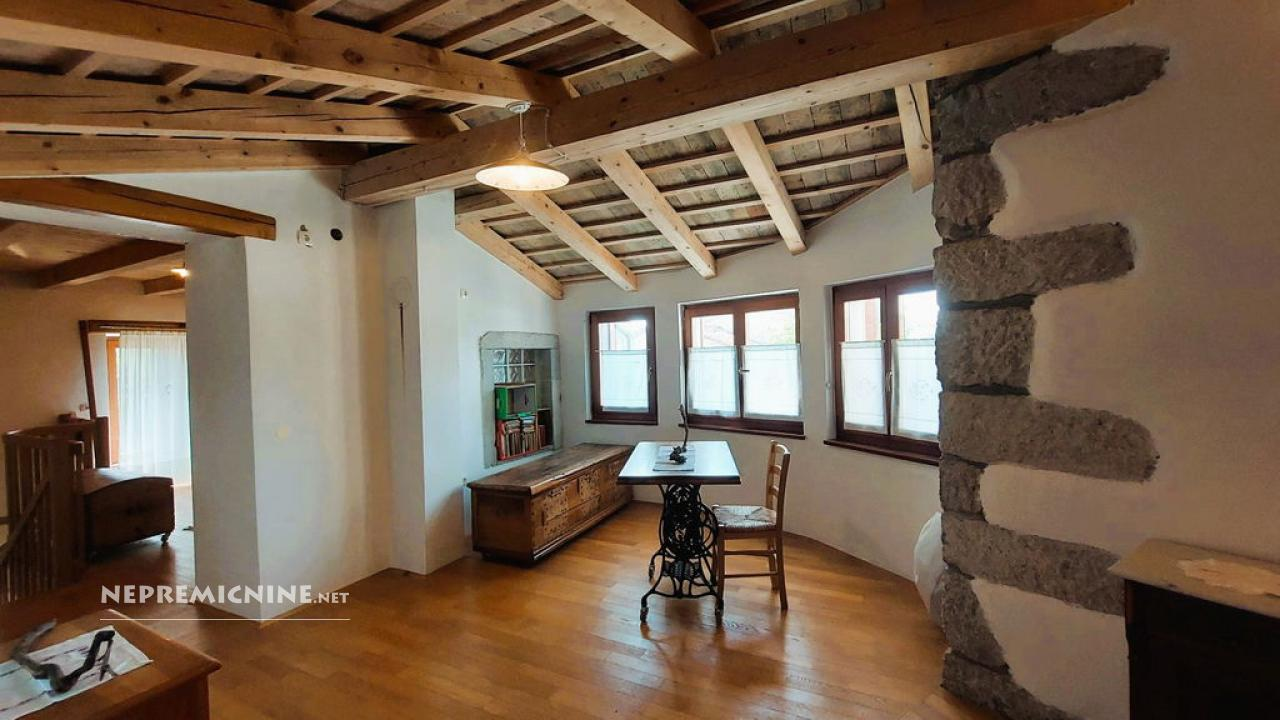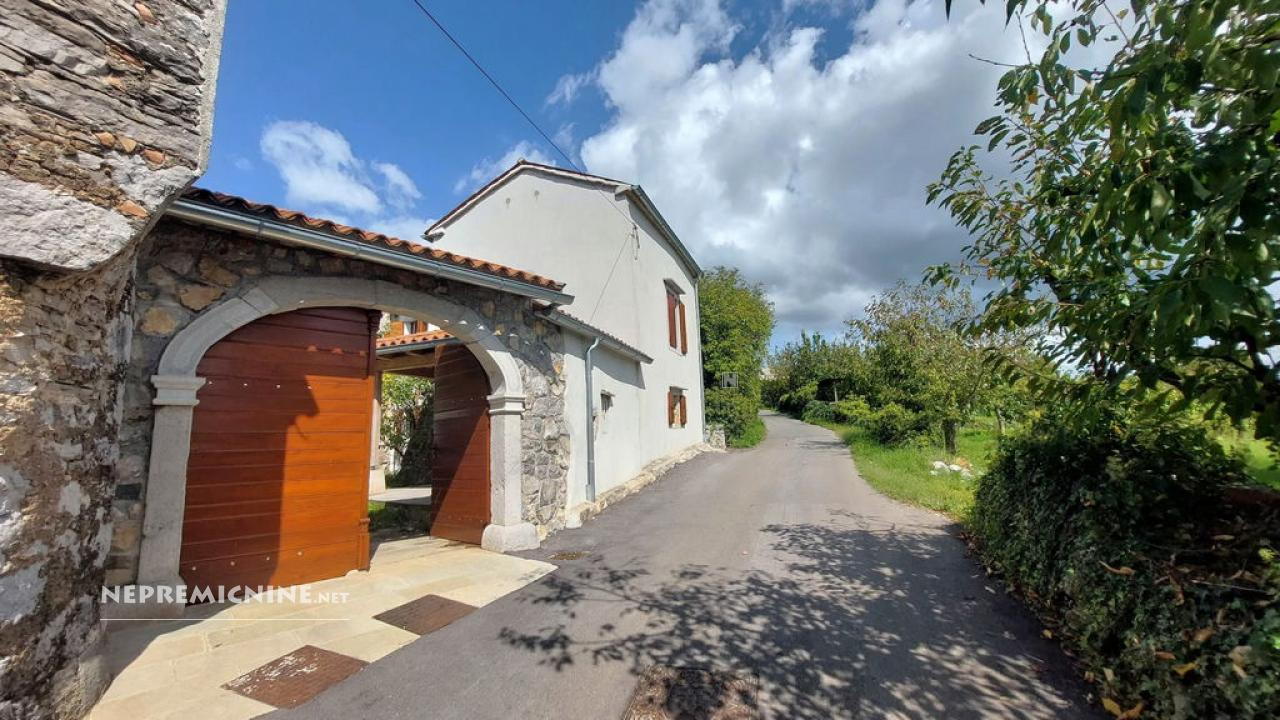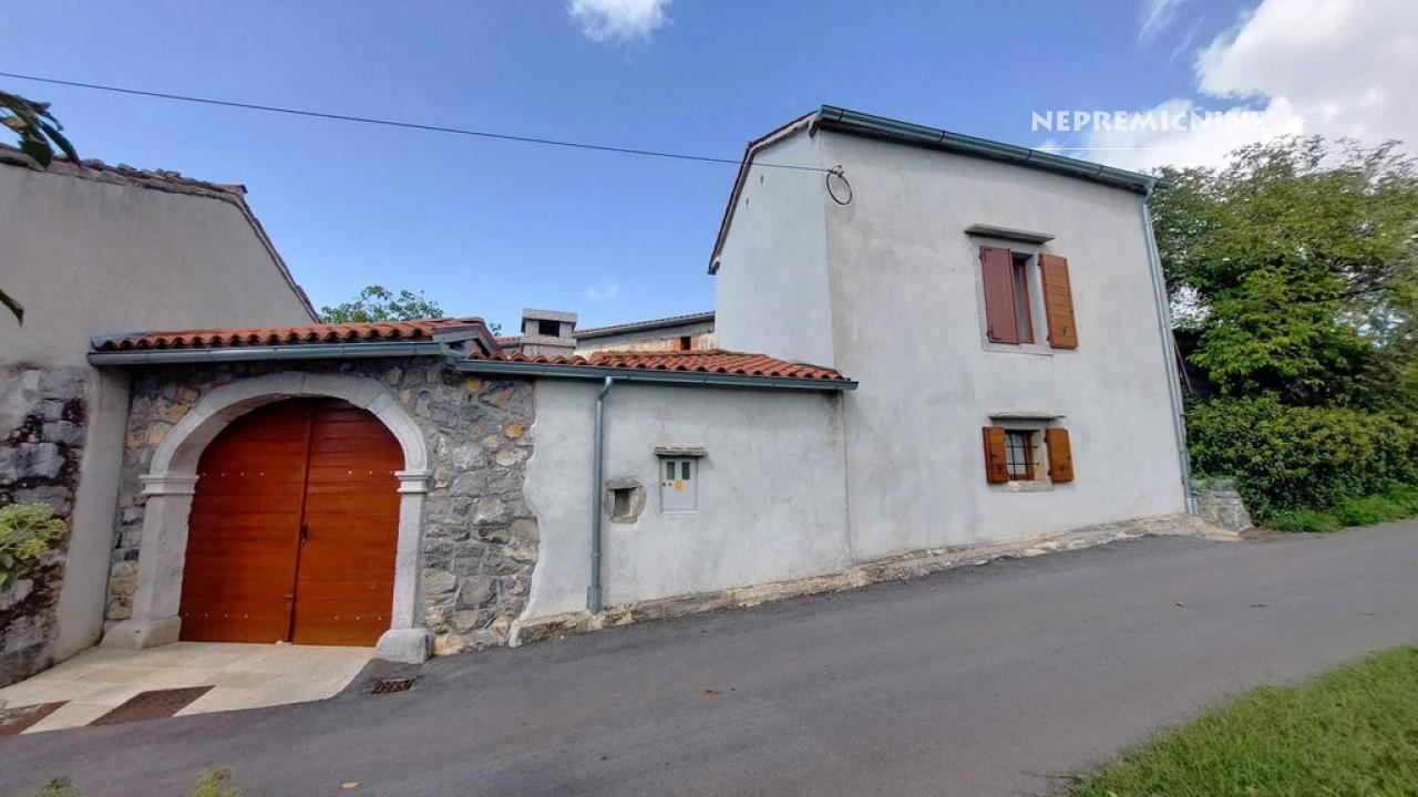 Dit unieke eigendom biedt een perfecte combinatie van traditionele architectuur en moderne gemakken. De hoofdwoning is prachtig gerenoveerd en biedt een ruime woonkamer met zichtbare houten balken en een op maat gemaakte houten trap die naar de bovenverdieping leidt. Hier bevinden zich twee slaapkamers, waarvan de hoofdslaapkamer een adembenemend uitzicht biedt op de Nanos. De woning beschikt over een badkamer en een overdekt terras, ideaal voor ontspanning op warme dagen. Op het afgesloten binnenplaats, bereikbaar via een grote houten poort met een prachtige stenen boog, bevindt zich een authentieke stenen waterput. Naast de hoofdwoning staat een oude stenen bijgebouw dat renovatie nodig heeft, maar potentieel biedt voor extra woonruimte of appartementen. Het eigendom omvat ook landbouwgrond op ongeveer 100 meter afstand, perfect voor eigen teelt of recreatie.