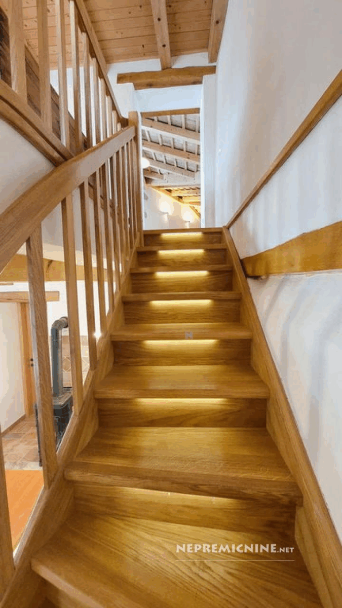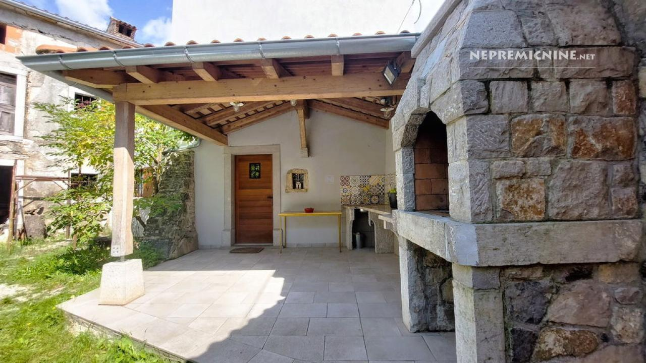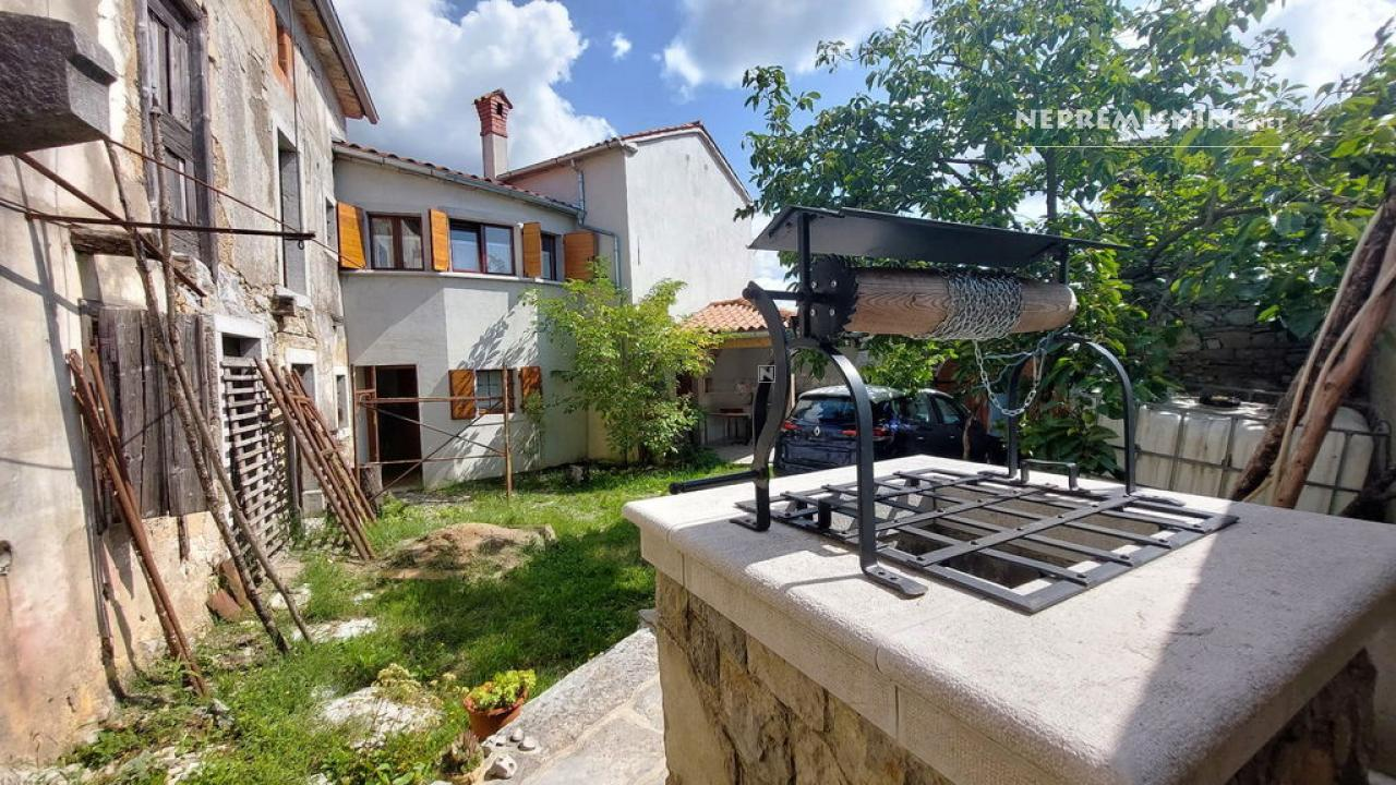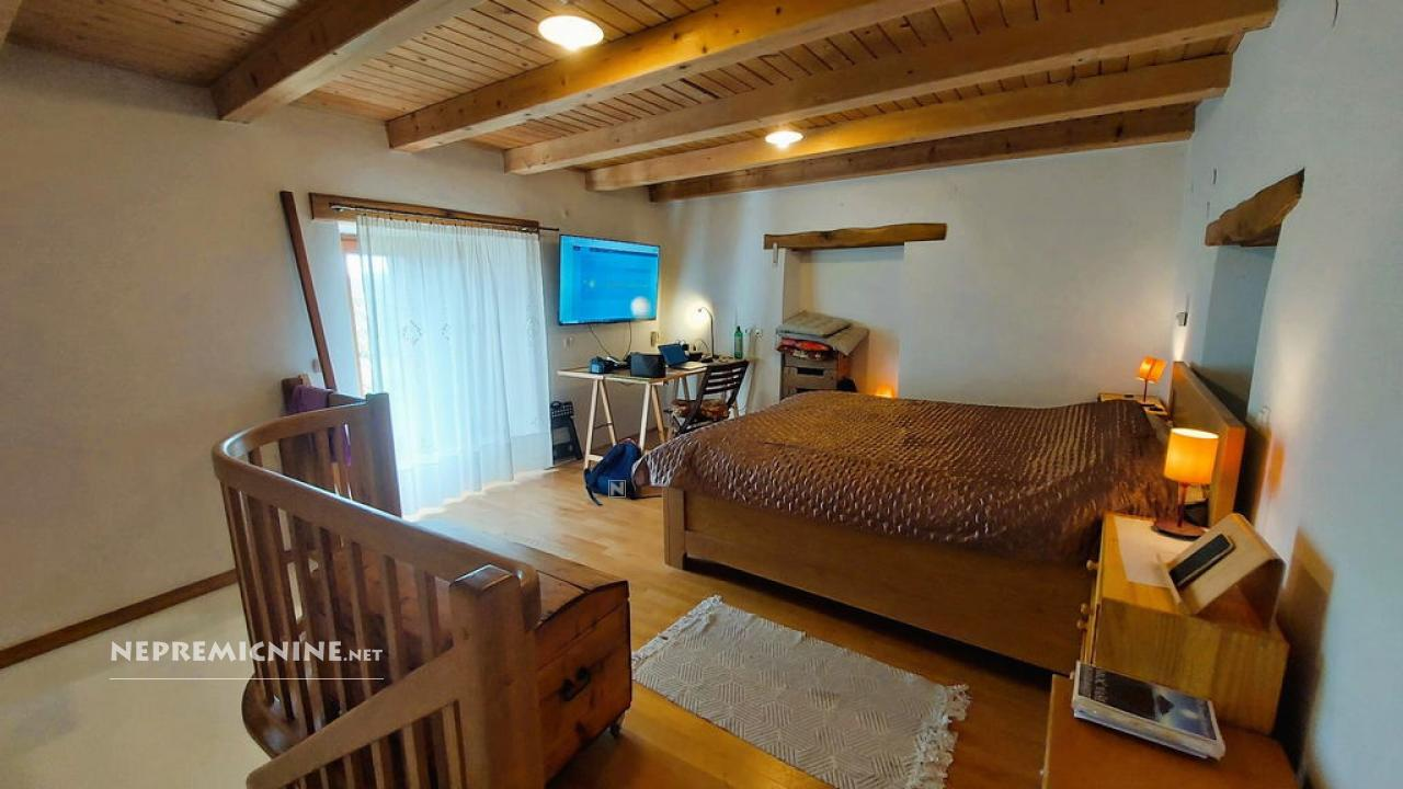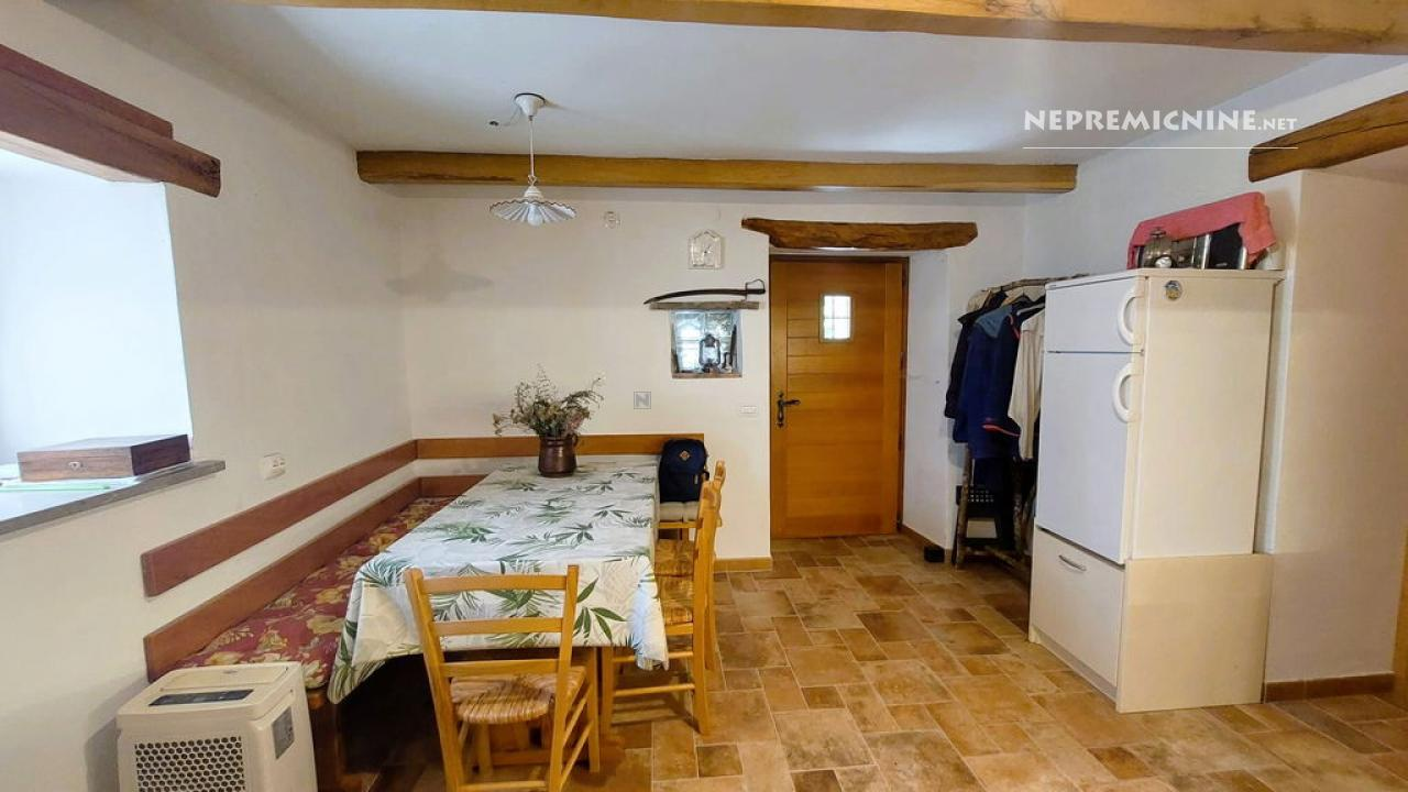 Dit unieke eigendom biedt een perfecte combinatie van traditionele architectuur en moderne gemakken. De hoofdwoning is prachtig gerenoveerd en biedt een ruime woonkamer met zichtbare houten balken en een op maat gemaakte houten trap die naar de bovenverdieping leidt. Hier bevinden zich twee slaapkamers, waarvan de hoofdslaapkamer een adembenemend uitzicht biedt op de Nanos. De woning beschikt over een badkamer en een overdekt terras, ideaal voor ontspanning op warme dagen. Op het afgesloten binnenplaats, bereikbaar via een grote houten poort met een prachtige stenen boog, bevindt zich een authentieke stenen waterput. Naast de hoofdwoning staat een oude stenen bijgebouw dat renovatie nodig heeft, maar potentieel biedt voor extra woonruimte of appartementen. Het eigendom omvat ook landbouwgrond op ongeveer 100 meter afstand, perfect voor eigen teelt of recreatie.