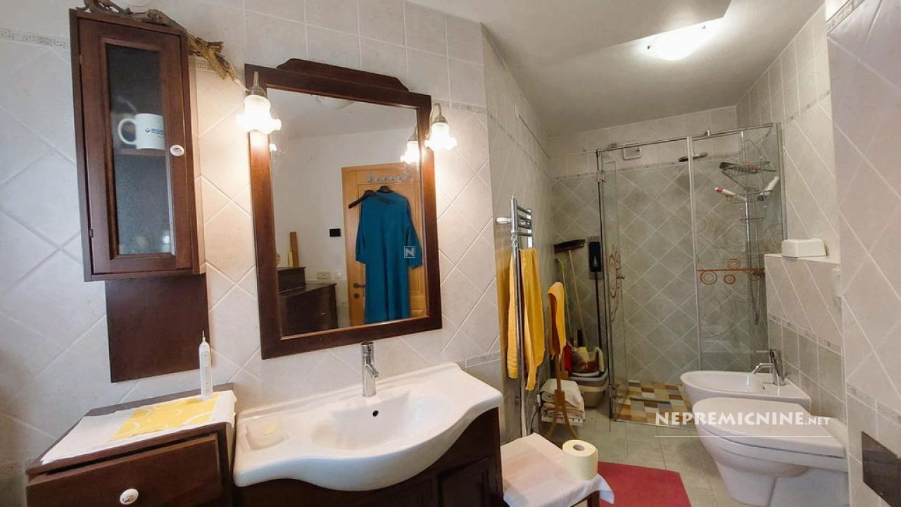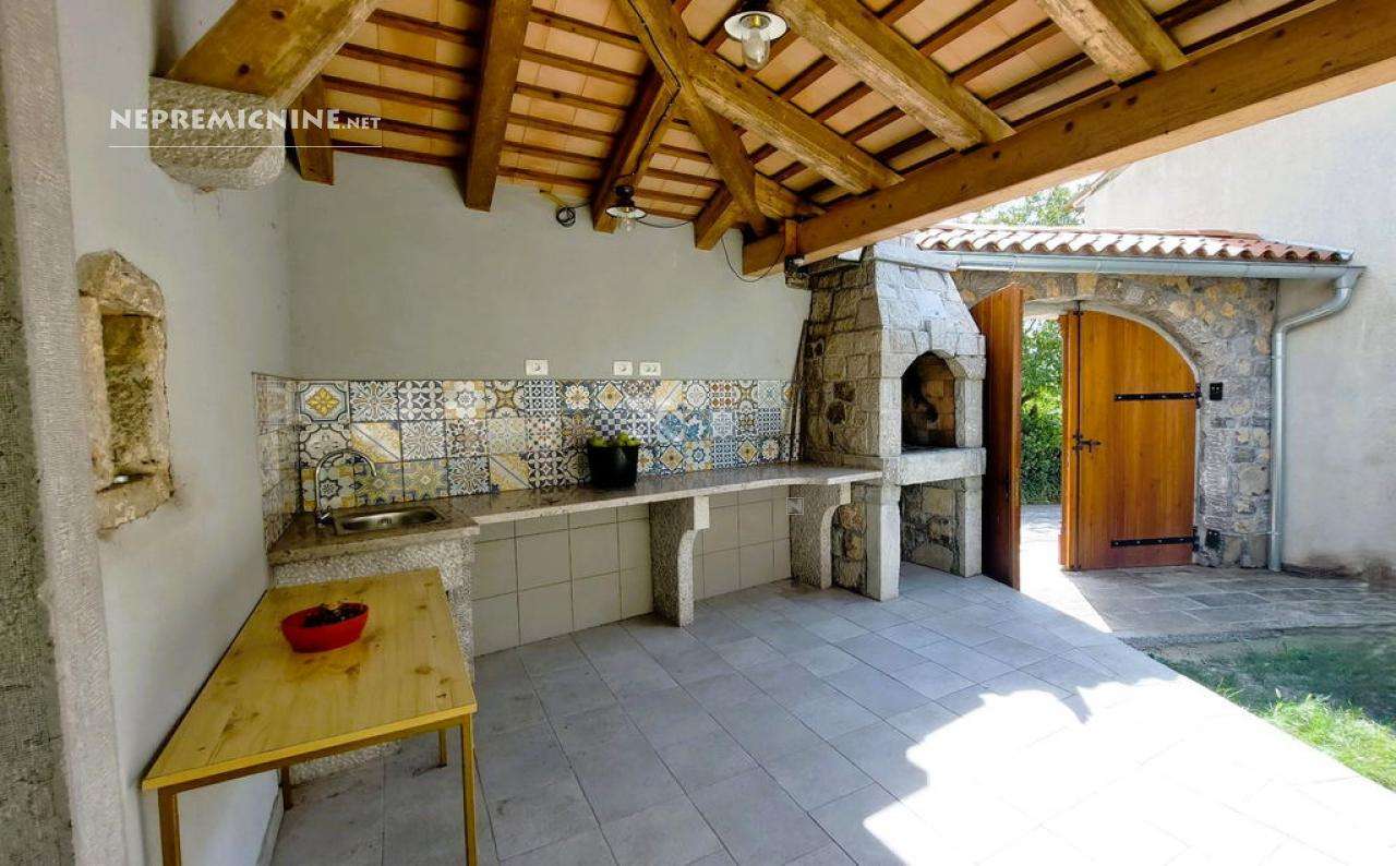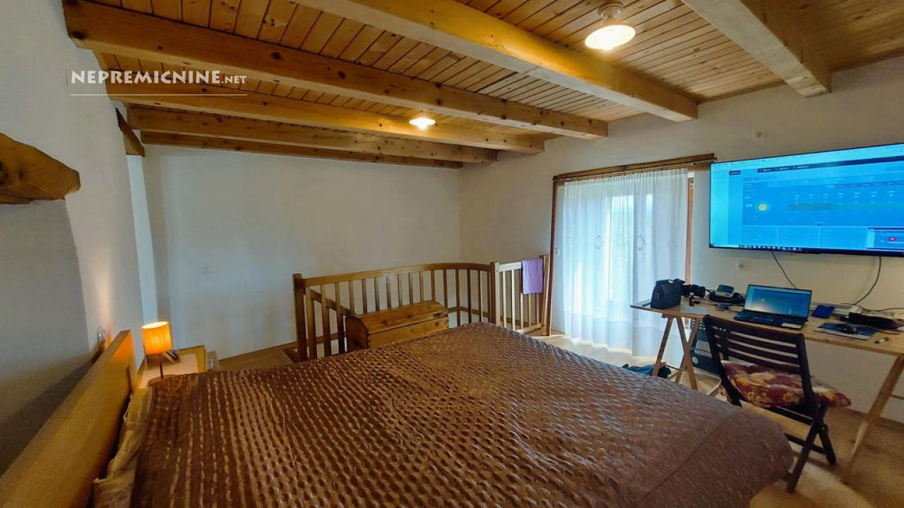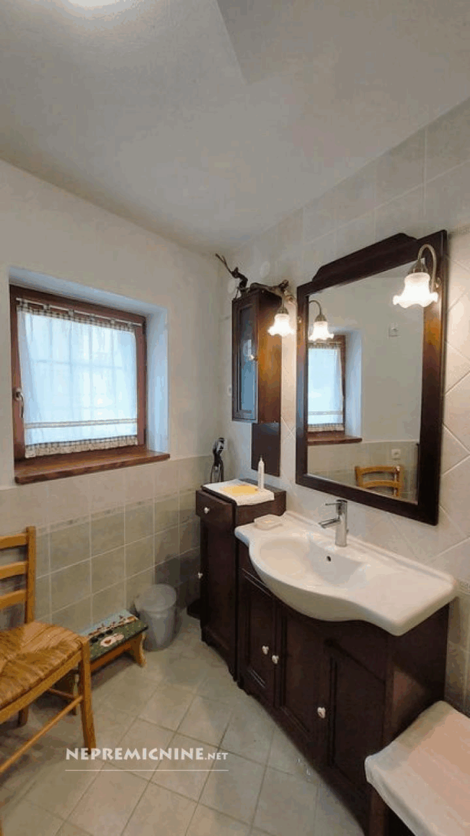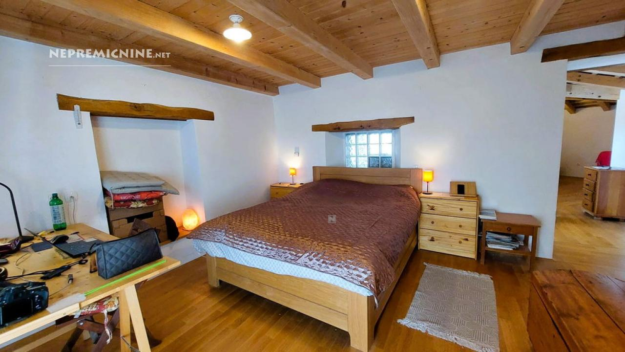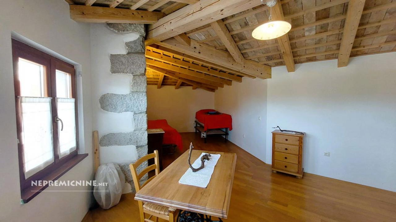 Dit unieke eigendom biedt een perfecte combinatie van traditionele architectuur en moderne gemakken. De hoofdwoning is prachtig gerenoveerd en biedt een ruime woonkamer met zichtbare houten balken en een op maat gemaakte houten trap die naar de bovenverdieping leidt. Hier bevinden zich twee slaapkamers, waarvan de hoofdslaapkamer een adembenemend uitzicht biedt op de Nanos. De woning beschikt over een badkamer en een overdekt terras, ideaal voor ontspanning op warme dagen. Op het afgesloten binnenplaats, bereikbaar via een grote houten poort met een prachtige stenen boog, bevindt zich een authentieke stenen waterput. Naast de hoofdwoning staat een oude stenen bijgebouw dat renovatie nodig heeft, maar potentieel biedt voor extra woonruimte of appartementen. Het eigendom omvat ook landbouwgrond op ongeveer 100 meter afstand, perfect voor eigen teelt of recreatie.