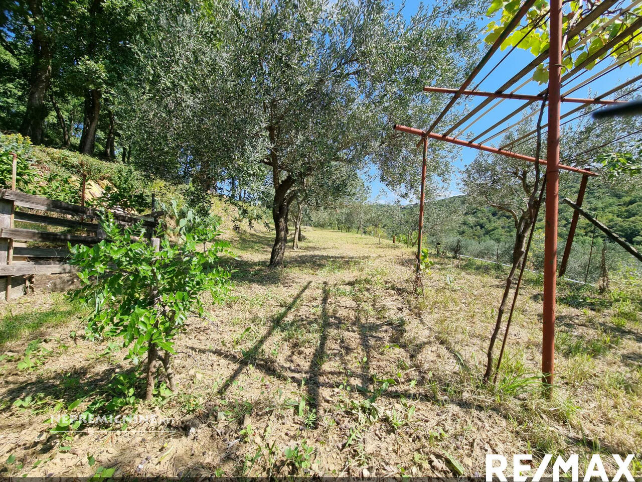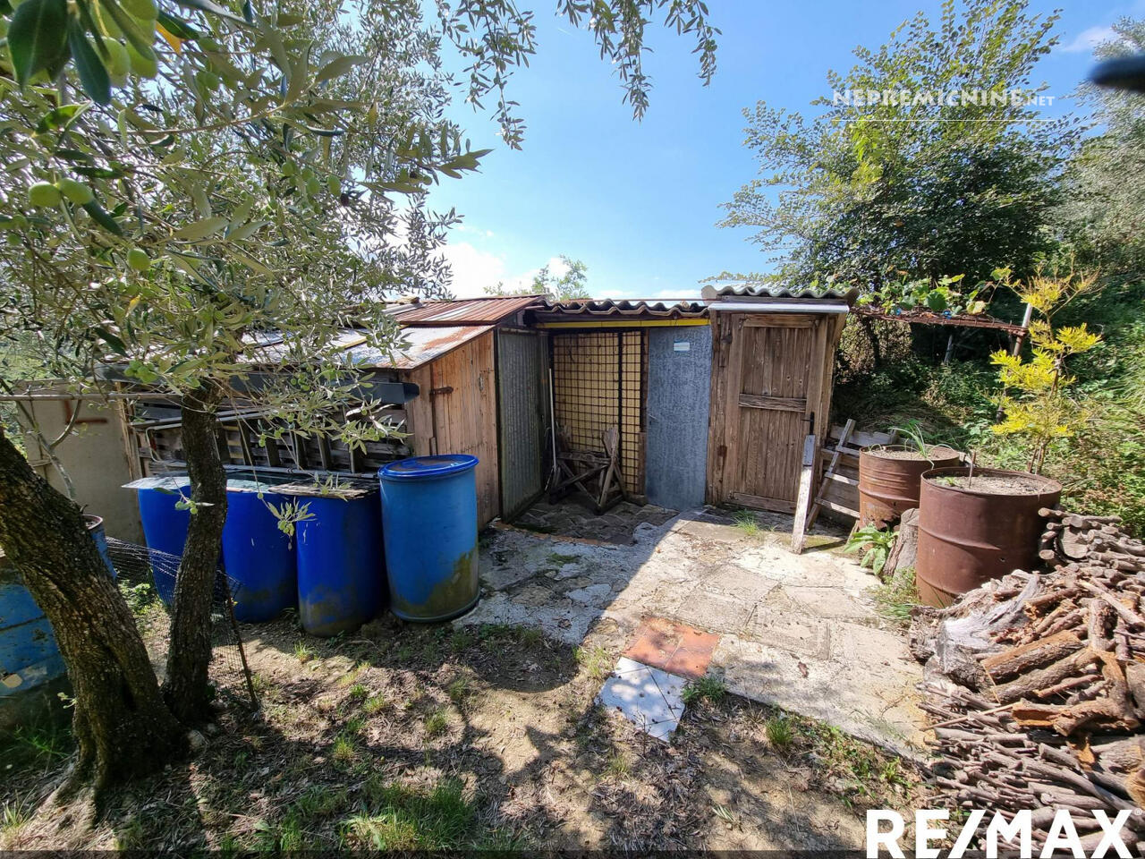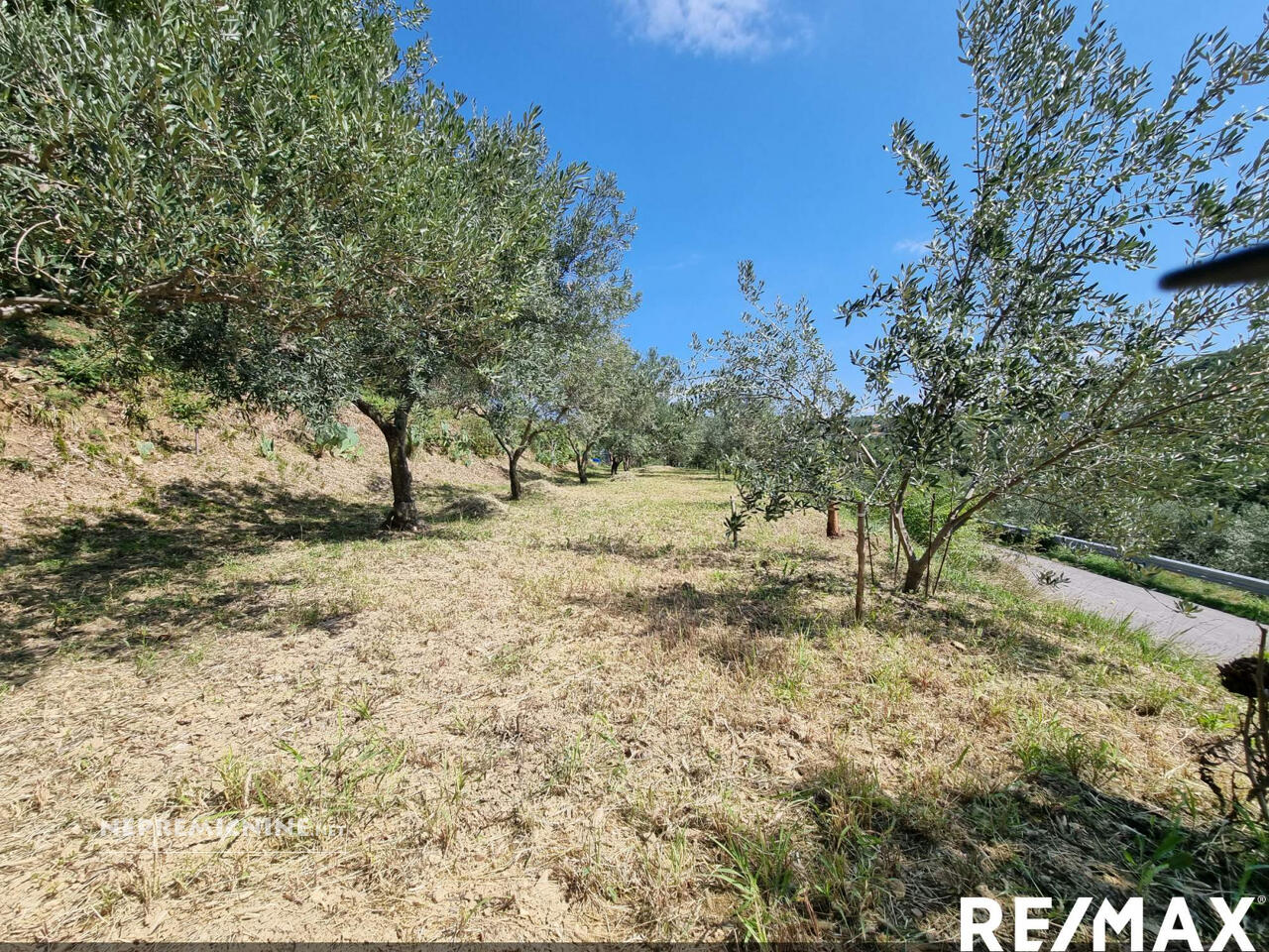 Het land is beplant met diverse fruitbomen, waaronder 22 olijfbomen, 4 mandarijnen, 1 kaki, 2 kweeperen, 1 pruim, 2 jujubes en 1 vijgenboom. Er zijn twee gebouwen op het terrein: een kleiner houten gebouw dat als opslagruimte dient en een groter stenen gebouw met een ingerichte zomerkeuken.