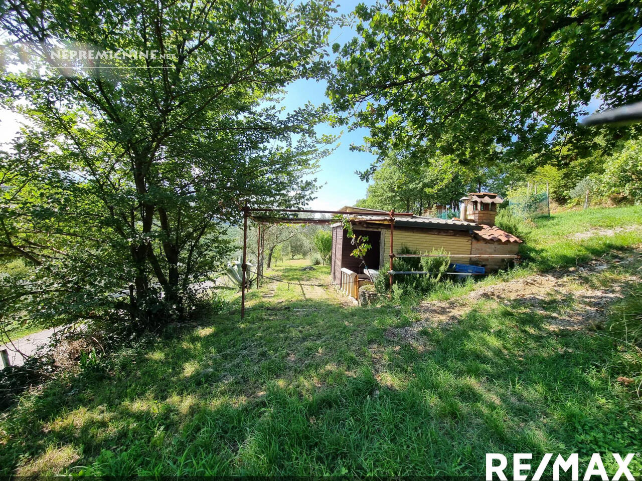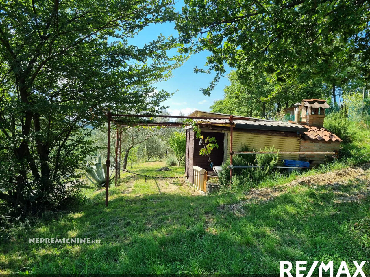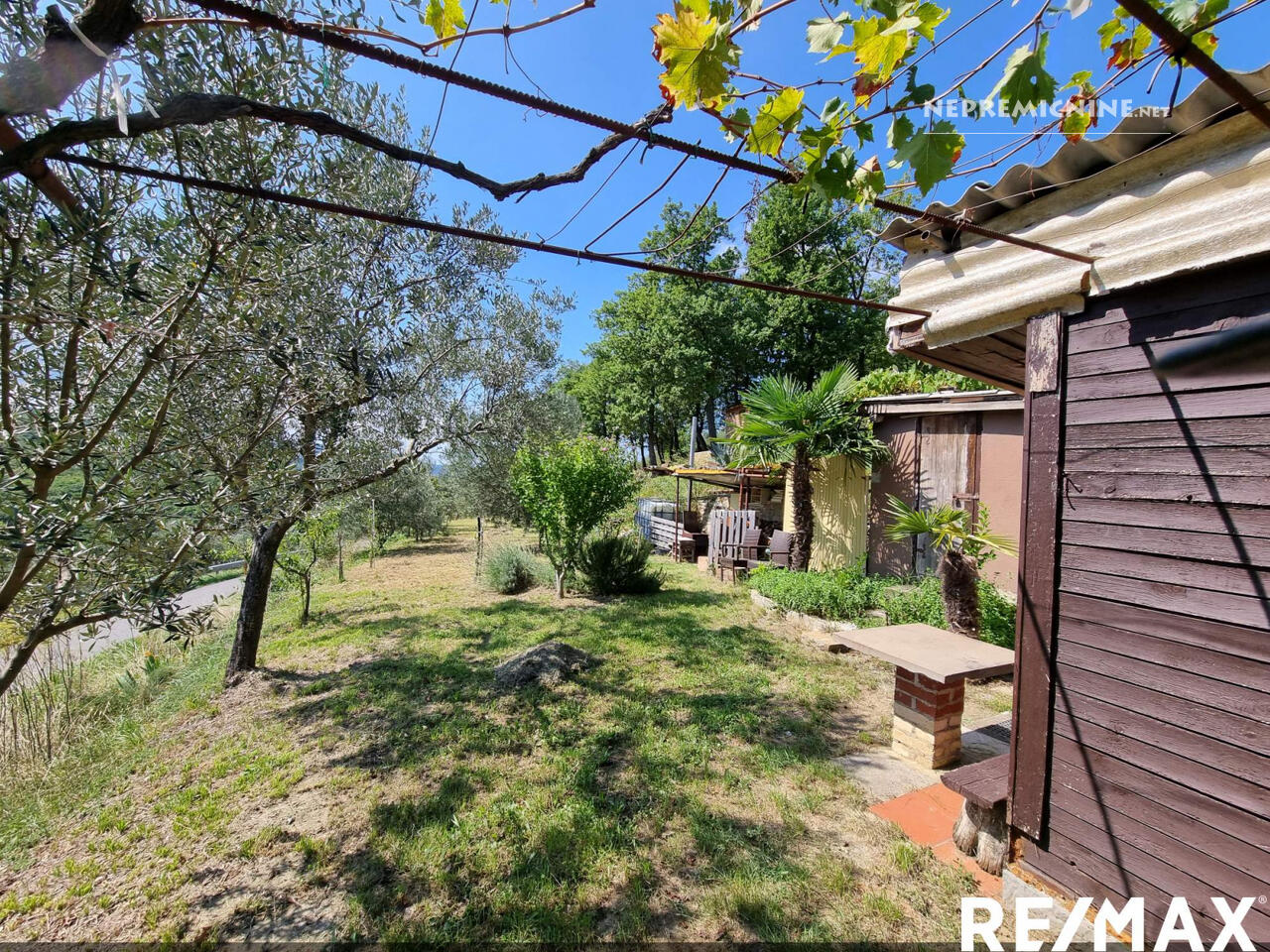 Het land is beplant met diverse fruitbomen, waaronder 22 olijfbomen, 4 mandarijnen, 1 kaki, 2 kweeperen, 1 pruim, 2 jujubes en 1 vijgenboom. Er zijn twee gebouwen op het terrein: een kleiner houten gebouw dat als opslagruimte dient en een groter stenen gebouw met een ingerichte zomerkeuken.
