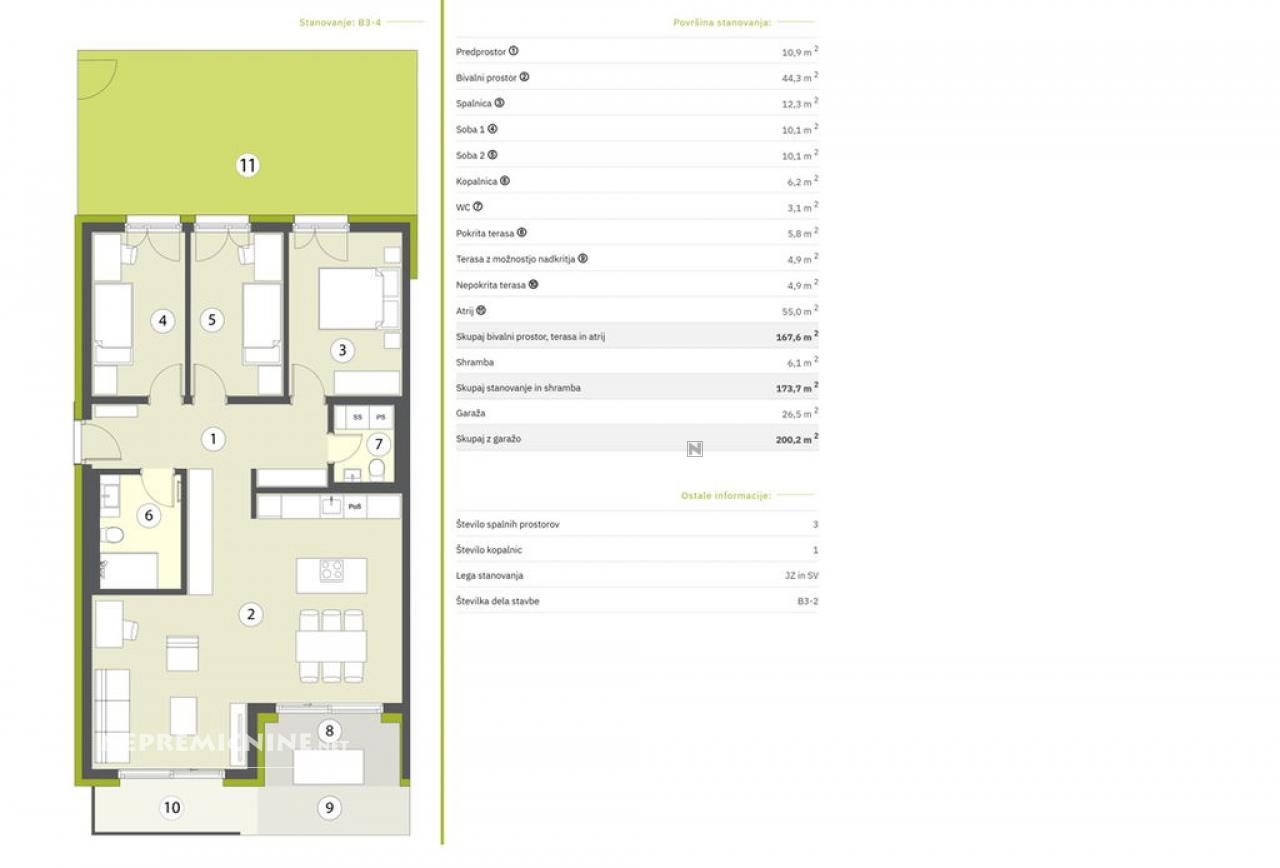 Dit vierkamerappartement B3-4 biedt een moderne architectuur gecombineerd met hoogwaardige materialen en adembenemende panoramische uitzichten. Met een oppervlakte van 173,7 m², inclusief een terras van 15,6 m² en een atrium van 55 m², is dit appartement perfect voor gezinnen die op zoek zijn naar een veilige en comfortabele woonomgeving. Geniet van de nabijheid van scholen, winkels, gezondheidsinstellingen en culturele en natuurlijke bezienswaardigheden.